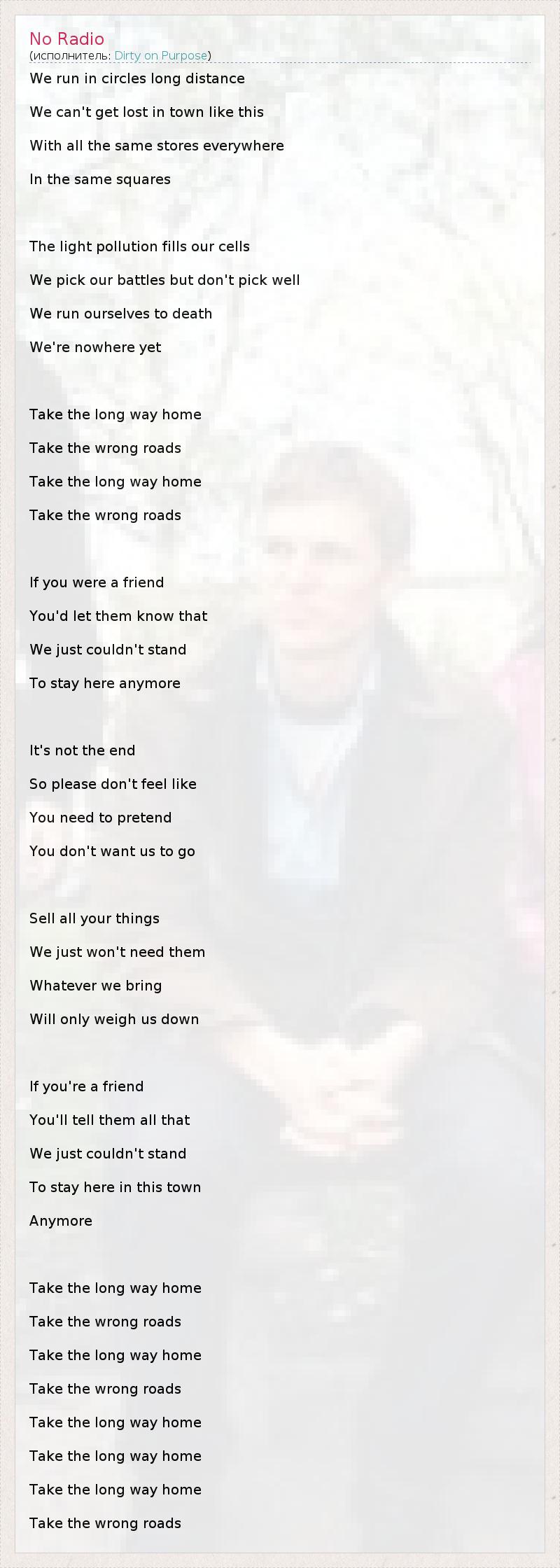 We run in circles long distance We can't get lost in town like this With all the same stores everywhere In the same squares The light pollution fills our cells We pick our battles but don't pick well We run ourselves to death We're nowhere yet Take the long way home Take the wrong roads Take the long way home Take the wrong roads If you were a friend You'd let them know that We just couldn't stand To stay here anymore It's not the end So please don't feel like You need to pretend You don't want us to go Sell all your things We just won't need them Whatever we bring Will only weigh us down If you're a friend You'll tell them all that We just couldn't stand To stay here in this town Anymore Take the long way home Take the wrong roads Take the long way home Take the wrong roads Take the long way home Take the long way home Take the long way home Take the wrong roads