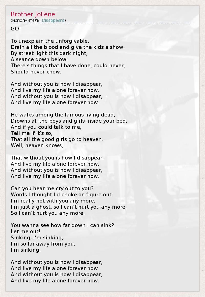 GO! To unexplain the unforgivable, Drain all the blood and give the kids a show. By street light this dark night, A sеance down below. There's things that I have done, could never, Should never know. And without you is how I disappear, And live my life alone forever now. And without you is how I disappear, And live my life alone forever now. He walks among the famous living dead, Drowns all the boys and girls inside your bed. And if you could talk to me, Tell me if it's so, That all the good girls go to heaven. Well, heaven knows, That without you is how I disappear. And live my life alone forever now. And without you is how I disappear, And live my life alone forever now. Can you hear me cry out to you? Words I thought I'd choke on figure out. I'm really not with you any more. I'm just a ghost, so I can't hurt you any more, So I can't hurt you any more. You wanna see how far down I can sink? Let me out! Sinking, I'm sinking, I'm so far away from you. I'm sinking. And without you is how I disappear, And live my life alone forever now. And without you is how I disappear, And live my life alone forever now.