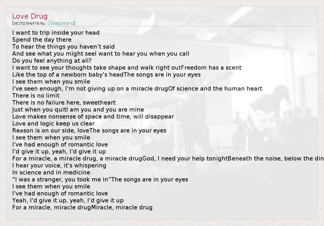 I want to trip inside your head Spend the day there To hear the things you haven't said And see what you might seeI want to hear you when you call Do you feel anything at all? I want to see your thoughts take shape and walk right outFreedom has a scent Like the top of a newborn baby's headThe songs are in your eyes I see them when you smile I've seen enough, I'm not giving up on a miracle drugOf science and the human heart There is no limit There is no failure here, sweetheart Just when you quitI am you and you are mine Love makes nonsense of space and time, will disappear Love and logic keep us clear Reason is on our side, loveThe songs are in your eyes I see them when you smile I've had enough of romantic love I'd give it up, yeah, I'd give it up For a miracle, a miracle drug, a miracle drugGod, I need your help tonightBeneath the noise, below the din I hear your voice, it's whispering In science and in medicine "I was a stranger, you took me in"The songs are in your eyes I see them when you smile I've had enough of romantic love Yeah, I'd give it up, yeah, I'd give it up For a miracle, miracle drugMiracle, miracle drug