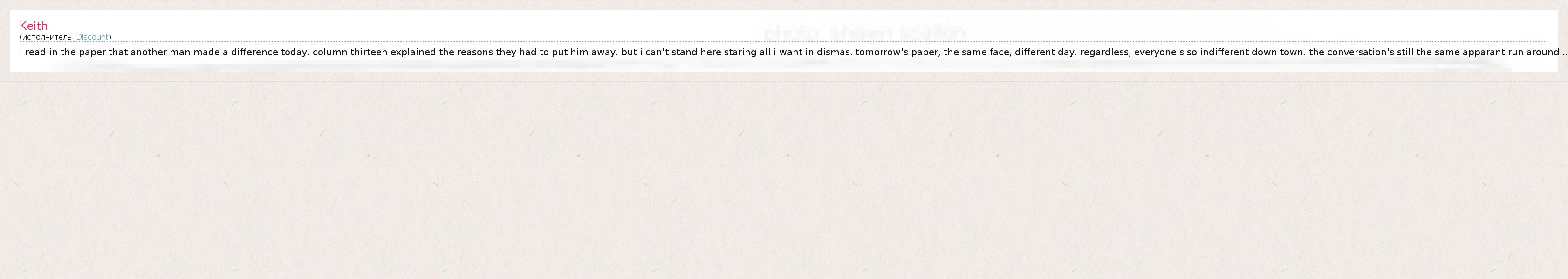 i read in the paper that another man made a difference today. column thirteen explained the reasons they had to put him away. but i can't stand here staring all i want in dismas. tomorrow's paper, the same face, different day. regardless, everyone's so indifferent down town. the conversation's still the same apparant run around...