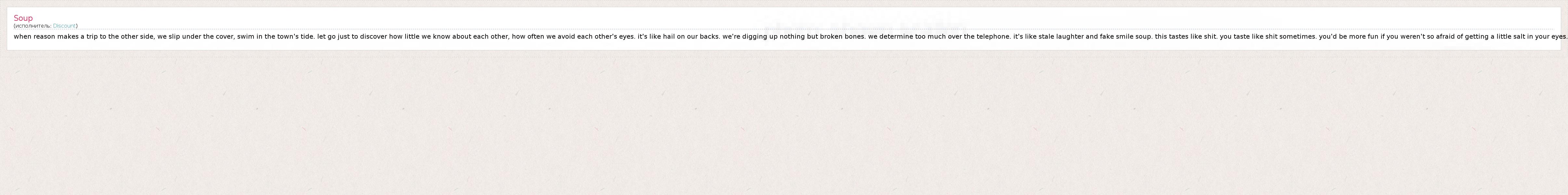 when reason makes a trip to the other side, we slip under the cover, swim in the town's tide. let go just to discover how little we know about each other, how often we avoid each other's eyes. it's like hail on our backs. we're digging up nothing but broken bones. we determine too much over the telephone. it's like stale laughter and fake smile soup. this tastes like shit. you taste like shit sometimes. you'd be more fun if you weren't so afraid of getting a little salt in your eyes.