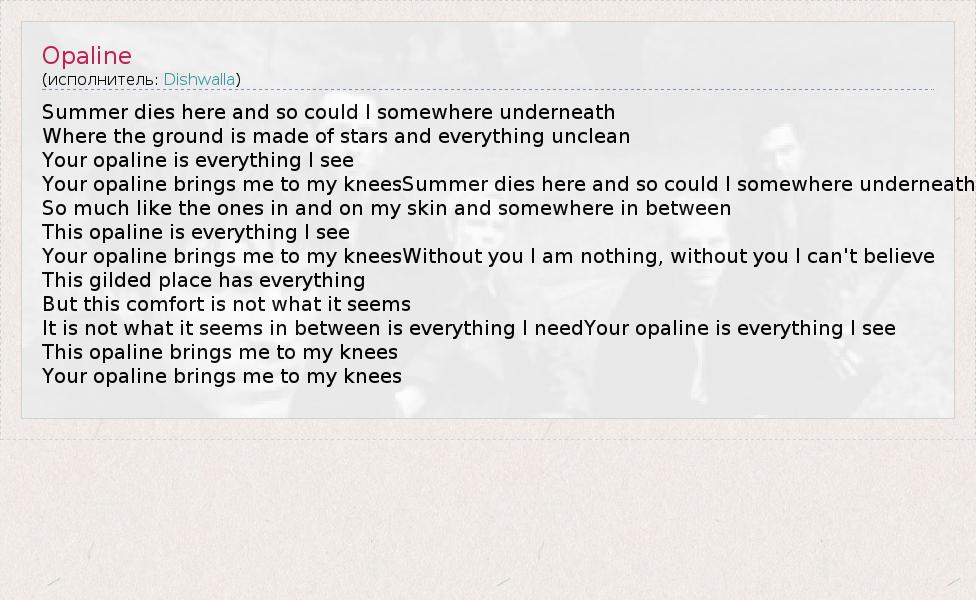 Your opaline brings me to my kneesSummer dies here and so could I somewhere underneath