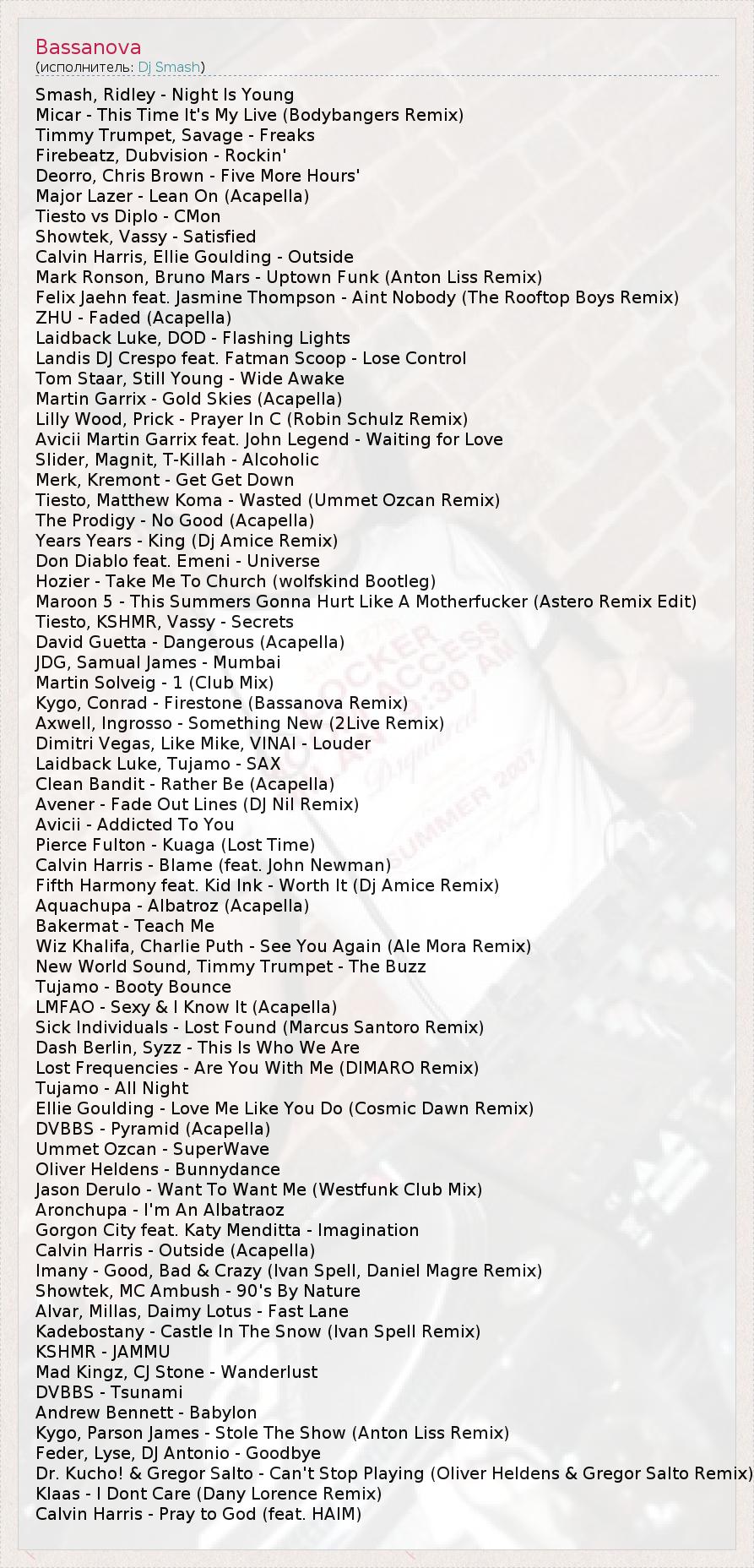 Smash, Ridley - Night Is Young Micar - This Time It's My Live (Bodybangers Remix) Timmy Trumpet, Savage - Freaks Firebeatz, Dubvision - Rockin' Deorro, Chris Brown - Five More Hours' Major Lazer - Lean On (Acapella) Tiesto vs Diplo - CMon Showtek, Vassy - Satisfied Calvin Harris, Ellie Goulding - Outside Mark Ronson, Bruno Mars - Uptown Funk (Anton Liss Remix) Felix Jaehn feat. Jasmine Thompson - Aint Nobody (The Rooftop Boys Remix) ZHU - Faded (Acapella) Laidback Luke, DOD - Flashing Lights Landis DJ Crespo feat. Fatman Scoop - Lose Control Tom Staar, Still Young - Wide Awake Martin Garrix - Gold Skies (Acapella) Lilly Wood, Prick - Prayer In C (Robin Schulz Remix) Avicii Martin Garrix feat. John Legend - Waiting for Love Slider, Magnit, T-Killah - Alcoholic Merk, Kremont - Get Get Down Tiesto, Matthew Koma - Wasted (Ummet Ozcan Remix) The Prodigy - No Good (Acapella) Years Years - King (Dj Amice Remix) Don Diablo feat. Emeni - Universe Hozier - Take Me To Church (wolfskind Bootleg) Maroon 5 - This Summers Gonna Hurt Like A Motherfucker (Astero Remix Edit) Tiesto, KSHMR, Vassy - Secrets David Guetta - Dangerous (Acapella) JDG, Samual James - Mumbai Martin Solveig - 1 (Club Mix) Kygo, Conrad - Firestone (Bassanova Remix) Axwell, Ingrosso - Something New (2Live Remix) Dimitri Vegas, Like Mike, VINAI - Louder Laidback Luke, Tujamo - SAX Clean Bandit - Rather Be (Acapella) Avener - Fade Out Lines (DJ Nil Remix) Avicii - Addicted To You Pierce Fulton - Kuaga (Lost Time) Calvin Harris - Blame (feat. John Newman) Fifth Harmony feat. Kid Ink - Worth It (Dj Amice Remix) Aquachupa - Albatroz (Acapella) Bakermat - Teach Me Wiz Khalifa, Charlie Puth - See You Again (Ale Mora Remix) New World Sound, Timmy Trumpet - The Buzz Tujamo - Booty Bounce LMFAO - Sexy & I Know It (Acapella) Sick Individuals - Lost Found (Marcus Santoro Remix) Dash Berlin, Syzz - This Is Who We Are Lost Frequencies - Are You With Me (DIMARO Remix) Tujamo - All Night Ellie Goulding - Love Me Like You Do (Cosmic Dawn Remix) DVBBS - Pyramid (Acapella) Ummet Ozcan - SuperWave Oliver Heldens - Bunnydance Jason Derulo - Want To Want Me (Westfunk Club Mix) Aronchupa - I'm An Albatraoz Gorgon City feat. Katy Menditta - Imagination Calvin Harris - Outside (Acapella) Imany - Good, Bad & Crazy (Ivan Spell, Daniel Magre Remix) Showtek, MC Ambush - 90's By Nature Alvar, Millas, Daimy Lotus - Fast Lane Kadebostany - Castle In The Snow (Ivan Spell Remix) KSHMR - JAMMU Mad Kingz, CJ Stone - Wanderlust DVBBS - Tsunami Andrew Bennett - Babylon Kygo, Parson James - Stole The Show (Anton Liss Remix) Feder, Lyse, DJ Antonio - Goodbye Dr. Kucho! & Gregor Salto - Can't Stop Playing (Oliver Heldens & Gregor Salto Remix) Klaas - I Dont Care (Dany Lorence Remix) Calvin Harris - Pray to God (feat. HAIM)