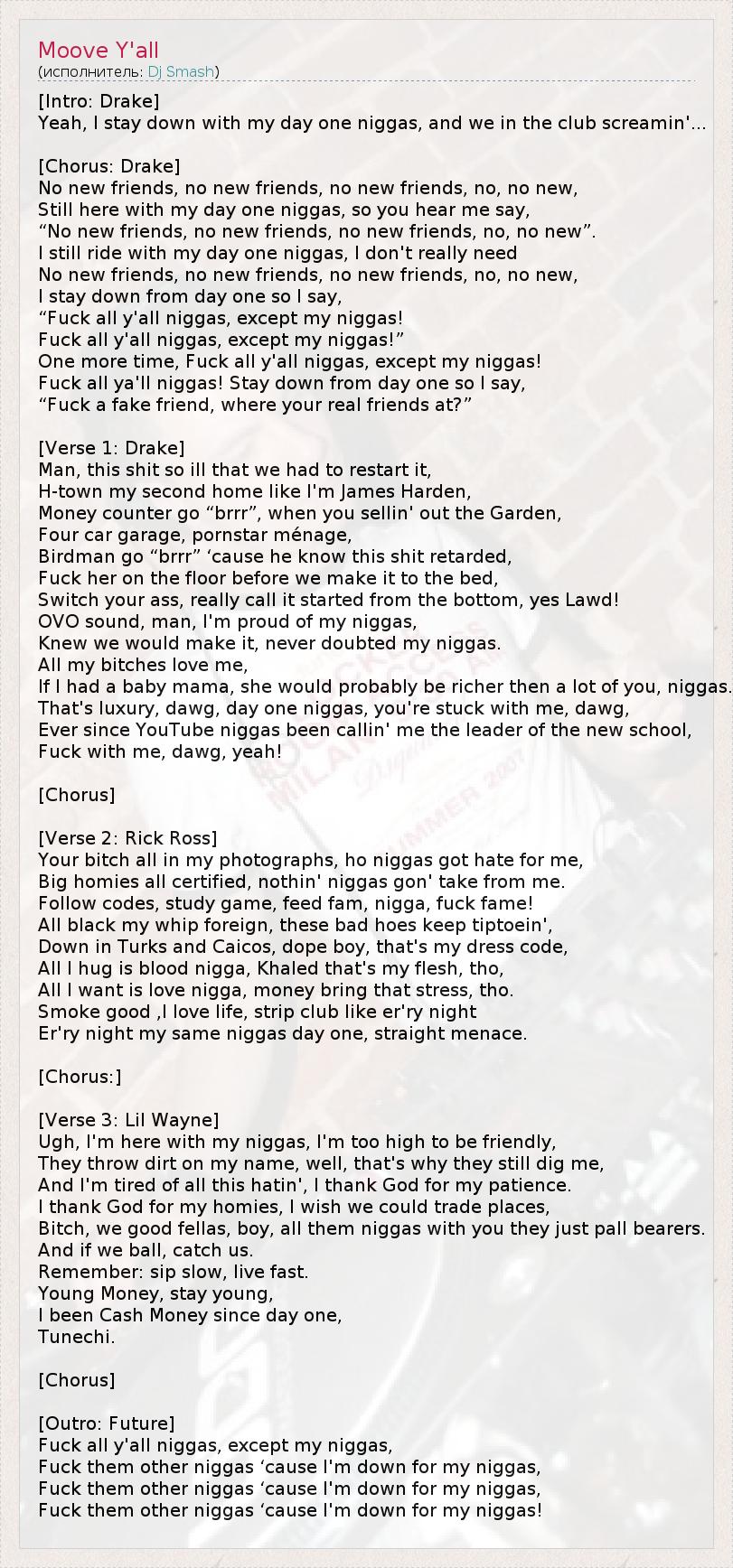 [Intro: Drake] Yeah, I stay down with my day one niggas, and we in the club screamin'... [Chorus: Drake] No new friends, no new friends, no new friends, no, no new, Still here with my day one niggas, so you hear me say, “No new friends, no new friends, no new friends, no, no new”. I still ride with my day one niggas, I don't really need No new friends, no new friends, no new friends, no, no new, I stay down from day one so I say, “Fuck all y'all niggas, except my niggas! Fuck all y'all niggas, except my niggas!” One more time, Fuck all y'all niggas, except my niggas! Fuck all ya'll niggas! Stay down from day one so I say, “Fuck a fake friend, where your real friends at?” [Verse 1: Drake] Man, this shit so ill that we had to restart it, H-town my second home like I'm James Harden, Money counter go “brrr”, when you sellin' out the Garden, Four car garage, pornstar ménage, Birdman go “brrr” ‘cause he know this shit retarded, Fuck her on the floor before we make it to the bed, Switch your ass, really call it started from the bottom, yes Lawd! OVO sound, man, I'm proud of my niggas, Knew we would make it, never doubted my niggas. All my bitches love me, If I had a baby mama, she would probably be richer then a lot of you, niggas. That's luxury, dawg, day one niggas, you're stuck with me, dawg, Ever since YouTube niggas been callin' me the leader of the new school, Fuck with me, dawg, yeah! [Chorus] [Verse 2: Rick Ross] Your bitch all in my photographs, ho niggas got hate for me, Big homies all certified, nothin' niggas gon' take from me. Follow codes, study game, feed fam, nigga, fuck fame! All black my whip foreign, these bad hoes keep tiptoein', Down in Turks and Caicos, dope boy, that's my dress code, All I hug is blood nigga, Khaled that's my flesh, tho, All I want is love nigga, money bring that stress, tho. Smoke good ,I love life, strip club like er'ry night Er'ry night my same niggas day one, straight menace. [Chorus:] [Verse 3: Lil Wayne] Ugh, I'm here with my niggas, I'm too high to be friendly, They throw dirt on my name, well, that's why they still dig me, And I'm tired of all this hatin', I thank God for my patience. I thank God for my homies, I wish we could trade places, Bitch, we good fellas, boy, all them niggas with you they just pall bearers. And if we ball, catch us. Remember: sip slow, live fast. Young Money, stay young, I been Cash Money since day one, Tunechi. [Chorus] [Outro: Future] Fuck all y'all niggas, except my niggas, Fuck them other niggas ‘cause I'm down for my niggas, Fuck them other niggas ‘cause I'm down for my niggas, Fuck them other niggas ‘cause I'm down for my niggas!