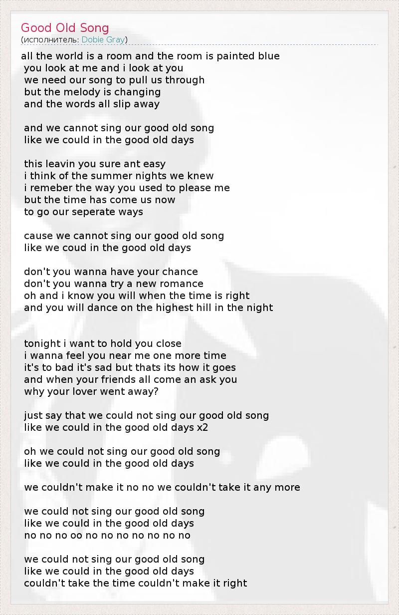 all the world is a room and the room is painted blue you look at me and i look at you we need our song to pull us through but the melody is changing and the words all slip away and we cannot sing our good old song like we could in the good old days this leavin you sure ant easy i think of the summer nights we knew i remeber the way you used to please me but the time has come us now to go our seperate ways cause we cannot sing our good old song like we coud in the good old days don't you wanna have your chance don't you wanna try a new romance oh and i know you will when the time is right and you will dance on the highest hill in the night tonight i want to hold you close i wanna feel you near me one more time it's to bad it's sad but thats its how it goes and when your friends all come an ask you why your lover went away? just say that we could not sing our good old song like we could in the good old days x2 oh we could not sing our good old song like we could in the good old days we couldn't make it no no we couldn't take it any more we could not sing our good old song like we could in the good old days no no no oo no no no no no no no we could not sing our good old song like we could in the good old days couldn't take the time couldn't make it right