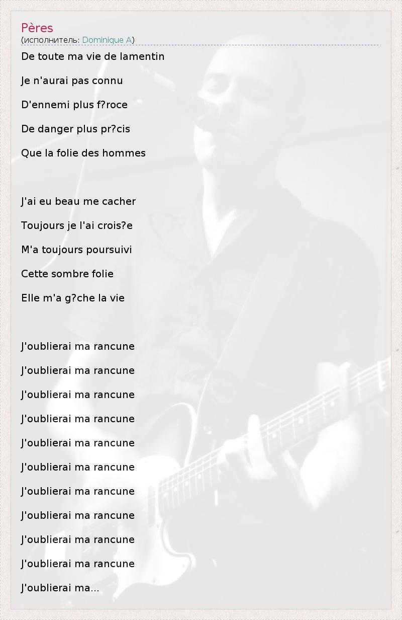 De toute ma vie de lamentin Je n'aurai pas connu D'ennemi plus f?roce De danger plus pr?cis Que la folie des hommes J'ai eu beau me cacher Toujours je l'ai crois?e M'a toujours poursuivi Cette sombre folie Elle m'a g?che la vie J'oublierai ma rancune J'oublierai ma rancune J'oublierai ma rancune J'oublierai ma rancune J'oublierai ma rancune J'oublierai ma rancune J'oublierai ma rancune J'oublierai ma rancune J'oublierai ma rancune J'oublierai ma rancune J'oublierai ma...
