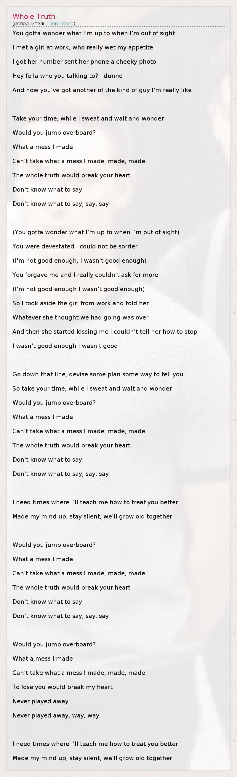 You gotta wonder what I'm up to when I'm out of sight I met a girl at work, who really wet my appetite I got her number sent her phone a cheeky photo Hey fella who you talking to? I dunno And now you've got another of the kind of guy I'm really like Take your time, while I sweat and wait and wonder Would you jump overboard? What a mess I made Can't take what a mess I made, made, made The whole truth would break your heart Don't know what to say Don't know what to say, say, say (You gotta wonder what I'm up to when I'm out of sight) You were devestated I could not be sorrier (I'm not good enough, I wasn't good enough) You forgave me and I really couldn't ask for more (I'm not good enough I wasn't good enough) So I took aside the girl from work and told her Whatever she thought we had going was over And then she started kissing me I couldn't tell her how to stop I wasn't good enough I wasn't good Go down that line, devise some plan some way to tell you So take your time, while I sweat and wait and wonder Would you jump overboard? What a mess I made Can't take what a mess I made, made, made The whole truth would break your heart Don't know what to say Don't know what to say, say, say I need times where I'll teach me how to treat you better Made my mind up, stay silent, we'll grow old together Would you jump overboard? What a mess I made Can't take what a mess I made, made, made The whole truth would break your heart Don't know what to say Don't know what to say, say, say Would you jump overboard? What a mess I made Can't take what a mess I made, made, made To lose you would break my heart Never played away Never played away, way, way I need times where I'll teach me how to treat you better Made my mind up, stay silent, we'll grow old together