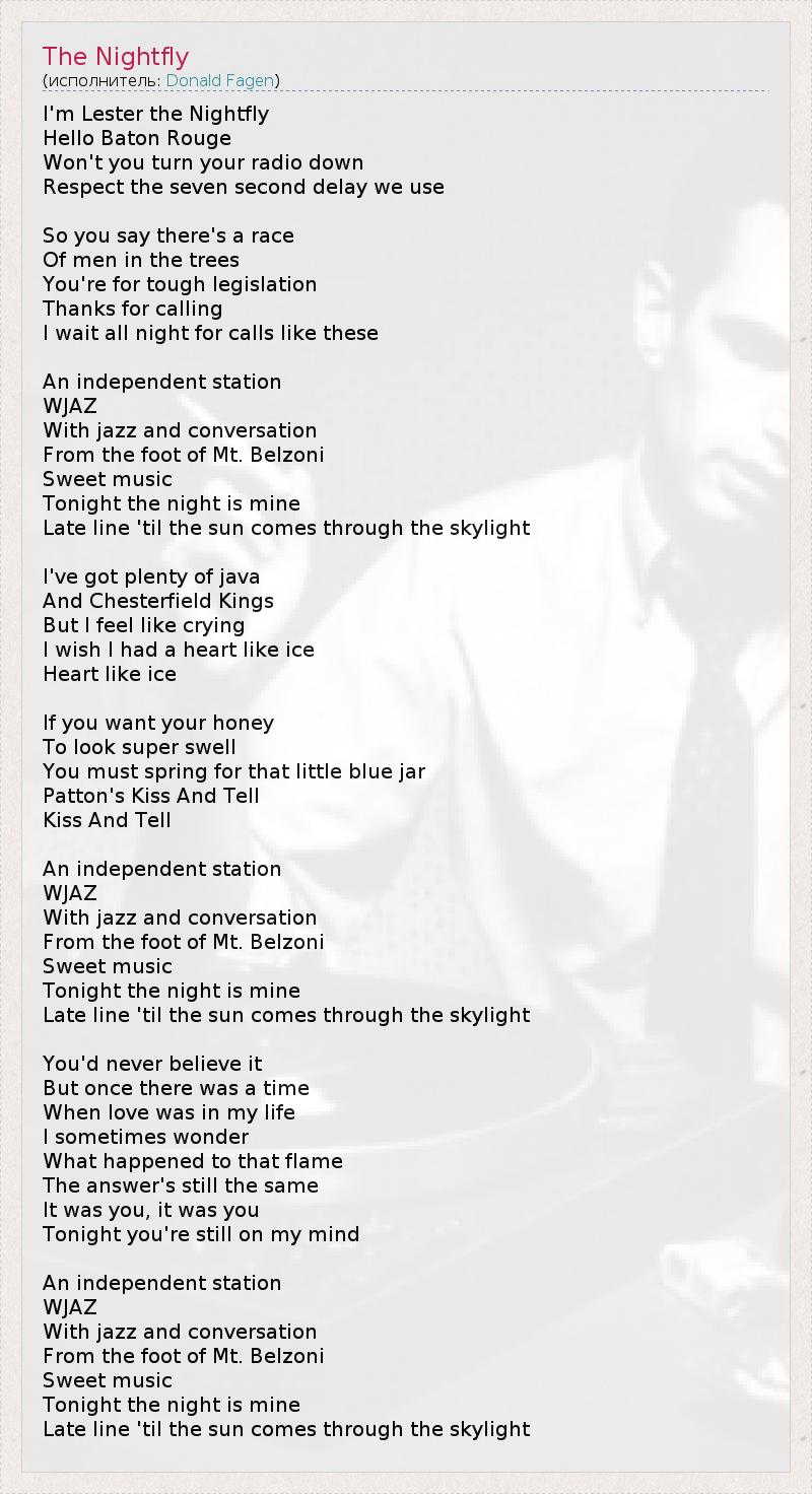 I'm Lester the Nightfly Hello Baton Rouge Won't you turn your radio down Respect the seven second delay we use So you say there's a race Of men in the trees You're for tough legislation Thanks for calling I wait all night for calls like these An independent station WJAZ With jazz and conversation From the foot of Mt. Belzoni Sweet music Tonight the night is mine Late line 'til the sun comes through the skylight I've got plenty of java And Chesterfield Kings But I feel like crying I wish I had a heart like ice Heart like ice If you want your honey To look super swell You must spring for that little blue jar Patton's Kiss And Tell Kiss And Tell An independent station WJAZ With jazz and conversation From the foot of Mt. Belzoni Sweet music Tonight the night is mine Late line 'til the sun comes through the skylight You'd never believe it But once there was a time When love was in my life I sometimes wonder What happened to that flame The answer's still the same It was you, it was you Tonight you're still on my mind An independent station WJAZ With jazz and conversation From the foot of Mt. Belzoni Sweet music Tonight the night is mine Late line 'til the sun comes through the skylight