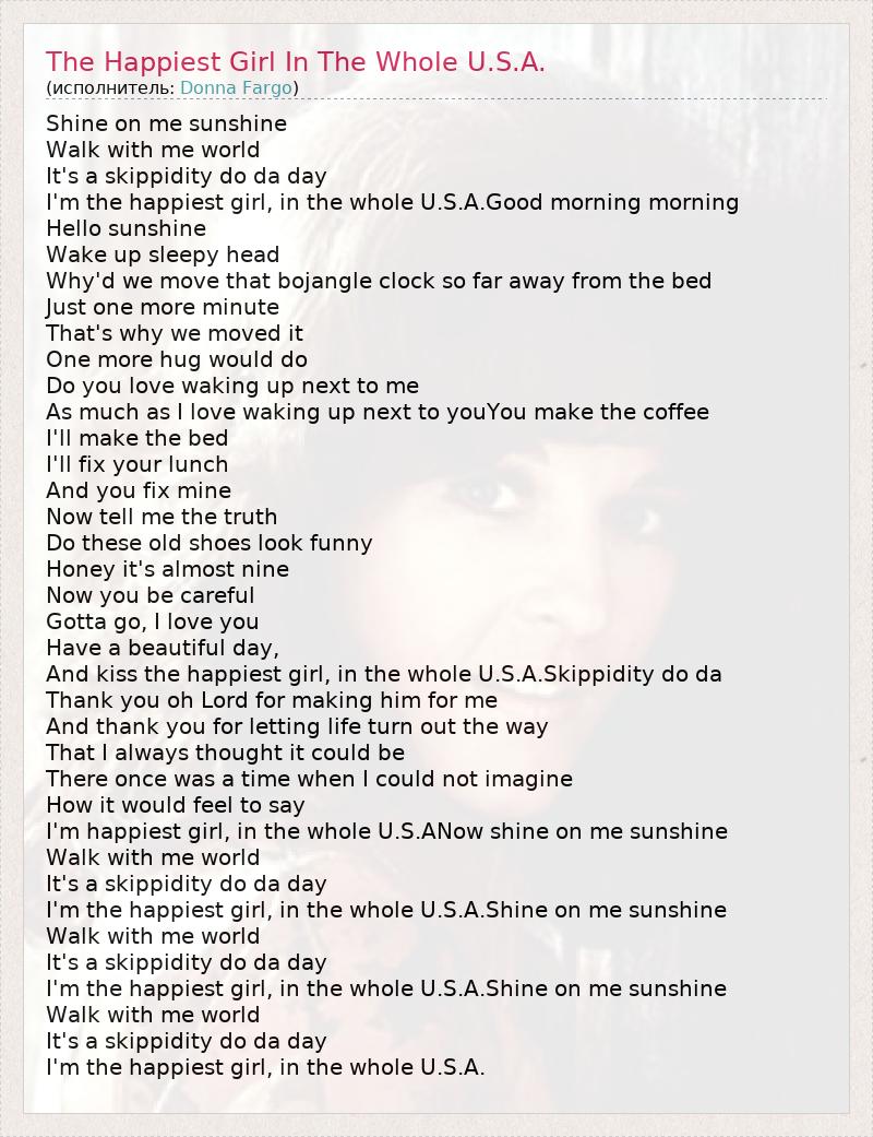 Shine on me sunshine Walk with me world It's a skippidity do da day I'm the happiest girl, in the whole U.S.A.Good morning morning Hello sunshine Wake up sleepy head Why'd we move that bojangle clock so far away from the bed Just one more minute That's why we moved it One more hug would do Do you love waking up next to me As much as I love waking up next to youYou make the coffee I'll make the bed I'll fix your lunch And you fix mine Now tell me the truth Do these old shoes look funny Honey it's almost nine Now you be careful Gotta go, I love you Have a beautiful day, And kiss the happiest girl, in the whole U.S.A.Skippidity do da Thank you oh Lord for making him for me And thank you for letting life turn out the way That I always thought it could be There once was a time when I could not imagine How it would feel to say I'm happiest girl, in the whole U.S.ANow shine on me sunshine Walk with me world It's a skippidity do da day I'm the happiest girl, in the whole U.S.A.Shine on me sunshine Walk with me world It's a skippidity do da day I'm the happiest girl, in the whole U.S.A.Shine on me sunshine Walk with me world It's a skippidity do da day I'm the happiest girl, in the whole U.S.A.