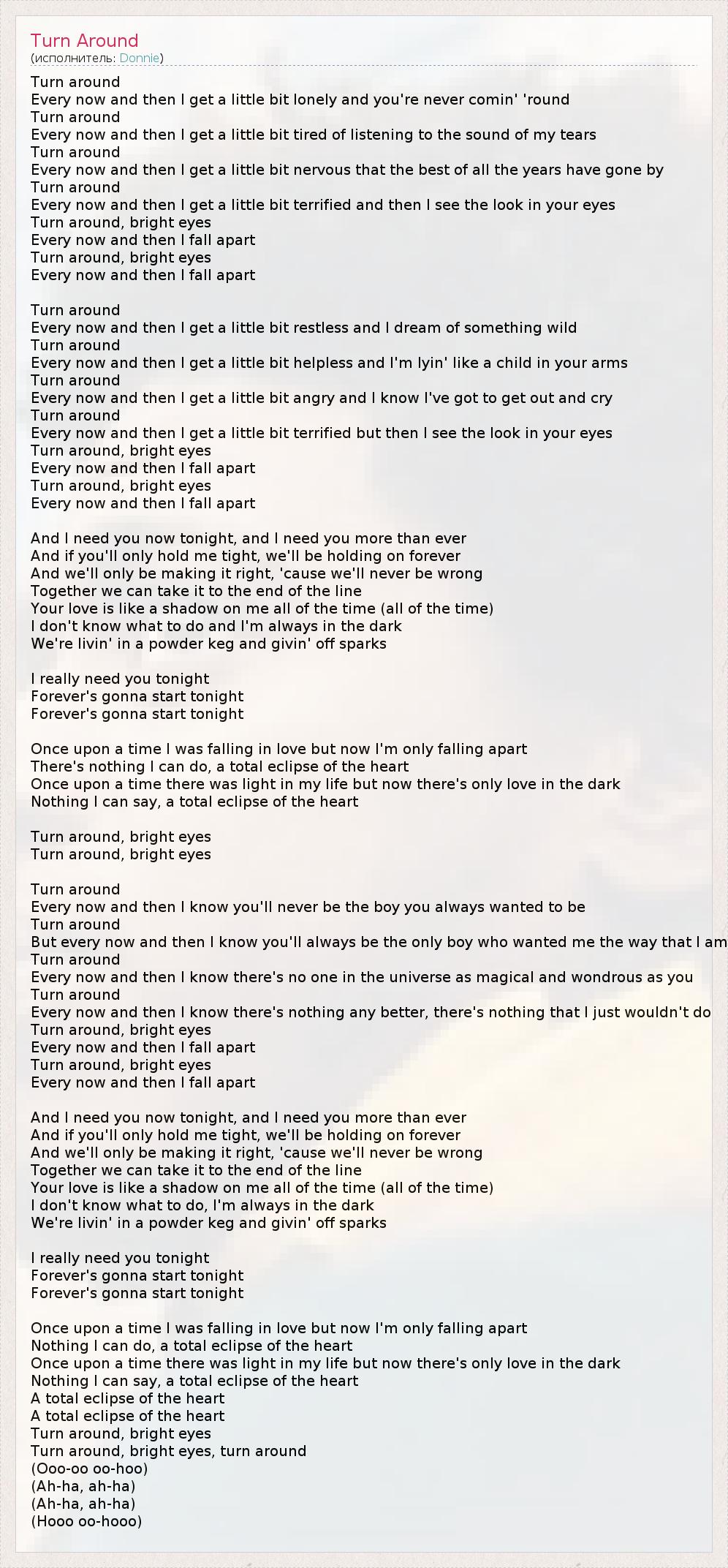 Turn around Every now and then I get a little bit lonely and you're never comin' 'round Turn around Every now and then I get a little bit tired of listening to the sound of my tears Turn around Every now and then I get a little bit nervous that the best of all the years have gone by Turn around Every now and then I get a little bit terrified and then I see the look in your eyes Turn around, bright eyes Every now and then I fall apart Turn around, bright eyes Every now and then I fall apart Turn around Every now and then I get a little bit restless and I dream of something wild Turn around Every now and then I get a little bit helpless and I'm lyin' like a child in your arms Turn around Every now and then I get a little bit angry and I know I've got to get out and cry Turn around Every now and then I get a little bit terrified but then I see the look in your eyes Turn around, bright eyes Every now and then I fall apart Turn around, bright eyes Every now and then I fall apart And I need you now tonight, and I need you more than ever And if you'll only hold me tight, we'll be holding on forever And we'll only be making it right, 'cause we'll never be wrong Together we can take it to the end of the line Your love is like a shadow on me all of the time (all of the time) I don't know what to do and I'm always in the dark We're livin' in a powder keg and givin' off sparks I really need you tonight Forever's gonna start tonight Forever's gonna start tonight Once upon a time I was falling in love but now I'm only falling apart There's nothing I can do, a total eclipse of the heart Once upon a time there was light in my life but now there's only love in the dark Nothing I can say, a total eclipse of the heart Turn around, bright eyes Turn around, bright eyes Turn around Every now and then I know you'll never be the boy you always wanted to be Turn around But every now and then I know you'll always be the only boy who wanted me the way that I am Turn around Every now and then I know there's no one in the universe as magical and wondrous as you Turn around Every now and then I know there's nothing any better, there's nothing that I just wouldn't do Turn around, bright eyes Every now and then I fall apart Turn around, bright eyes Every now and then I fall apart And I need you now tonight, and I need you more than ever And if you'll only hold me tight, we'll be holding on forever And we'll only be making it right, 'cause we'll never be wrong Together we can take it to the end of the line Your love is like a shadow on me all of the time (all of the time) I don't know what to do, I'm always in the dark We're livin' in a powder keg and givin' off sparks I really need you tonight Forever's gonna start tonight Forever's gonna start tonight Once upon a time I was falling in love but now I'm only falling apart Nothing I can do, a total eclipse of the heart Once upon a time there was light in my life but now there's only love in the dark Nothing I can say, a total eclipse of the heart A total eclipse of the heart A total eclipse of the heart Turn around, bright eyes Turn around, bright eyes, turn around (Ooo-oo oo-hoo) (Ah-ha, ah-ha) (Ah-ha, ah-ha) (Hooo oo-hooo)