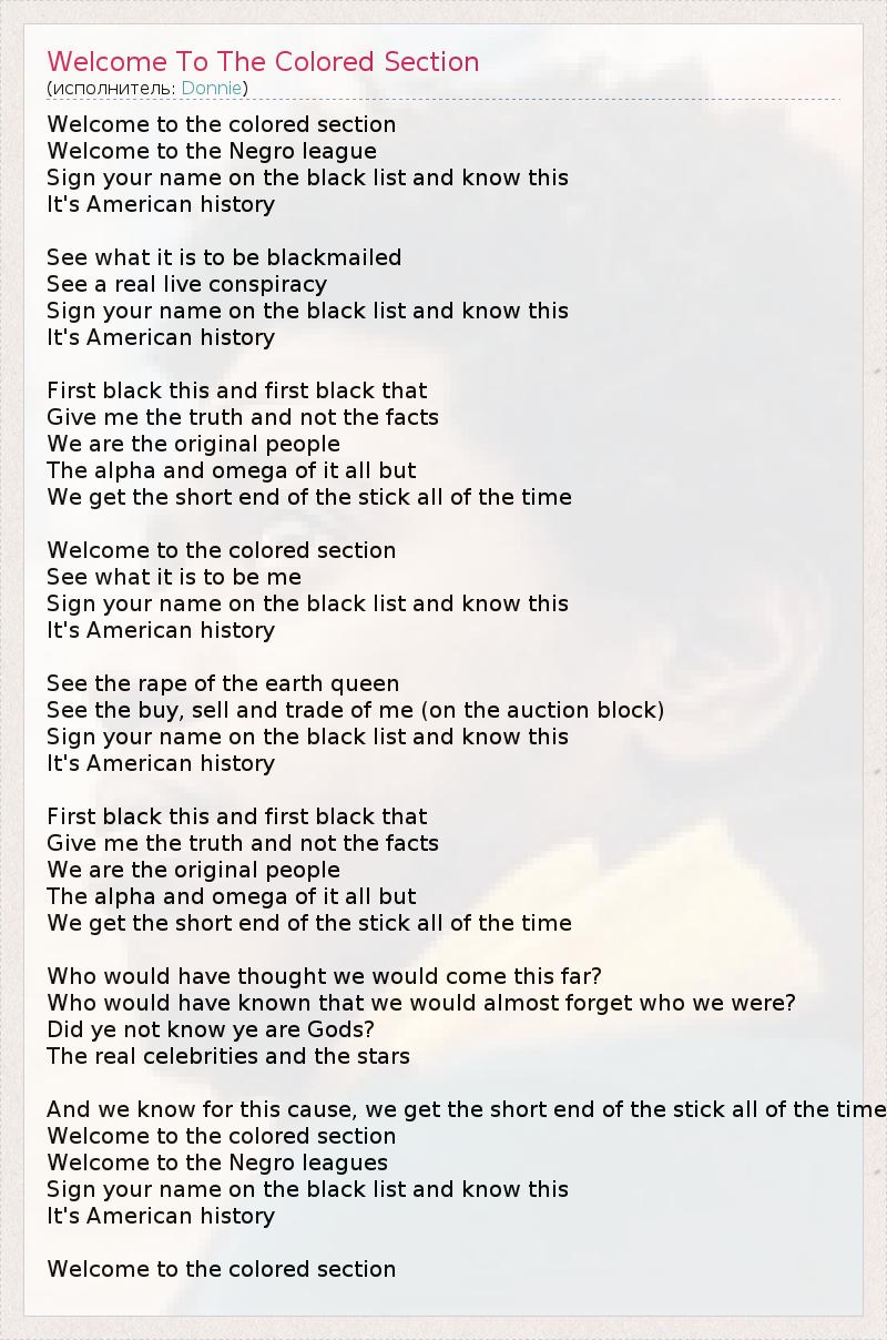 Welcome to the colored section Welcome to the Negro league Sign your name on the black list and know this It's American history See what it is to be blackmailed See a real live conspiracy Sign your name on the black list and know this It's American history First black this and first black that Give me the truth and not the facts We are the original people The alpha and omega of it all but We get the short end of the stick all of the time Welcome to the colored section See what it is to be me Sign your name on the black list and know this It's American history See the rape of the earth queen See the buy, sell and trade of me (on the auction block) Sign your name on the black list and know this It's American history First black this and first black that Give me the truth and not the facts We are the original people The alpha and omega of it all but We get the short end of the stick all of the time Who would have thought we would come this far? Who would have known that we would almost forget who we were? Did ye not know ye are Gods? The real celebrities and the stars And we know for this cause, we get the short end of the stick all of the time Welcome to the colored section Welcome to the Negro leagues Sign your name on the black list and know this It's American history Welcome to the colored section