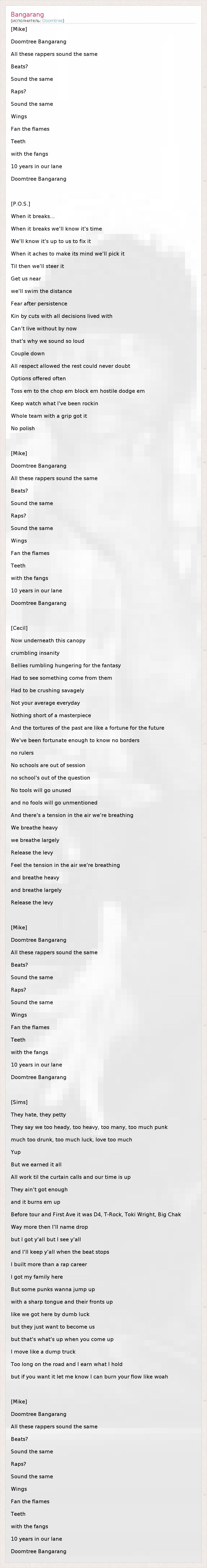 [Mike] Doomtree Bangarang All these rappers sound the same Beats? Sound the same Raps? Sound the same Wings Fan the flames Teeth with the fangs 10 years in our lane Doomtree Bangarang [P.O.S.] When it breaks... When it breaks we'll know it's time We'll know it's up to us to fix it When it aches to make its mind we'll pick it Til then we'll steer it Get us near we'll swim the distance Fear after persistence Kin by cuts with all decisions lived with Can't live without by now that's why we sound so loud Couple down All respect allowed the rest could never doubt Options offered often Toss em to the chop em block em hostile dodge em Keep watch what I've been rockin Whole team with a grip got it No polish [Mike] Doomtree Bangarang All these rappers sound the same Beats? Sound the same Raps? Sound the same Wings Fan the flames Teeth with the fangs 10 years in our lane Doomtree Bangarang [Cecil] Now underneath this canopy crumbling insanity Bellies rumbling hungering for the fantasy Had to see something come from them Had to be crushing savagely Not your average everyday Nothing short of a masterpiece And the tortures of the past are like a fortune for the future We've been fortunate enough to know no borders no rulers No schools are out of session no school's out of the question No tools will go unused and no fools will go unmentioned And there's a tension in the air we're breathing We breathe heavy we breathe largely Release the levy Feel the tension in the air we're breathing and breathe heavy and breathe largely Release the levy [Mike] Doomtree Bangarang All these rappers sound the same Beats? Sound the same Raps? Sound the same Wings Fan the flames Teeth with the fangs 10 years in our lane Doomtree Bangarang [Sims] They hate, they petty They say we too heady, too heavy, too many, too much punk much too drunk, too much luck, love too much Yup But we earned it all All work til the curtain calls and our time is up They ain't got enough and it burns em up Before tour and First Ave it was D4, T-Rock, Toki Wright, Big Chak Way more then I'll name drop but I got y'all but I see y'all and I'll keep y'all when the beat stops I built more than a rap career I got my family here But some punks wanna jump up with a sharp tongue and their fronts up like we got here by dumb luck but they just want to become us but that's what's up when you come up I move like a dump truck Too long on the road and I earn what I hold but if you want it let me know I can burn your flow like woah [Mike] Doomtree Bangarang All these rappers sound the same Beats? Sound the same Raps? Sound the same Wings Fan the flames Teeth with the fangs 10 years in our lane Doomtree Bangarang