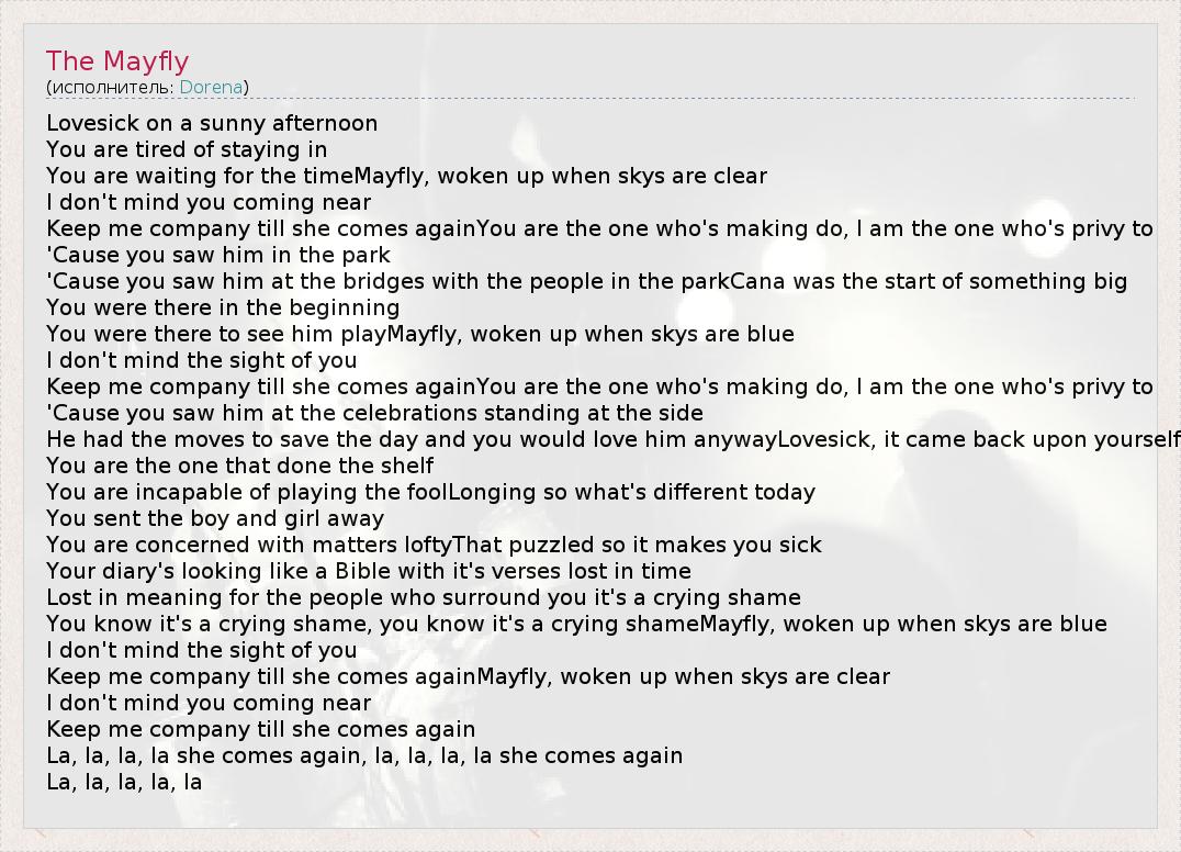 Keep me company till she comes againMayfly, woken up when skys are clear