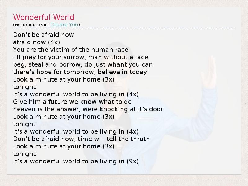 Don't be afraid now afraid now (4x) You are the victim of the human race I'll pray for your sorrow, man without a face beg, steal and borrow, do just whant you can there's hope for tomorrow, believe in today Look a minute at your home (3x) tonight It's a wonderful world to be living in (4x) Give him a future we know what to do heaven is the answer, were knocking at it's door Look a minute at your home (3x) tonight It's a wonderful world to be living in (4x) Don't be afraid now, time will tell the thruth Look a minute at your home (3x) tonight It's a wonderful world to be living in (9x)