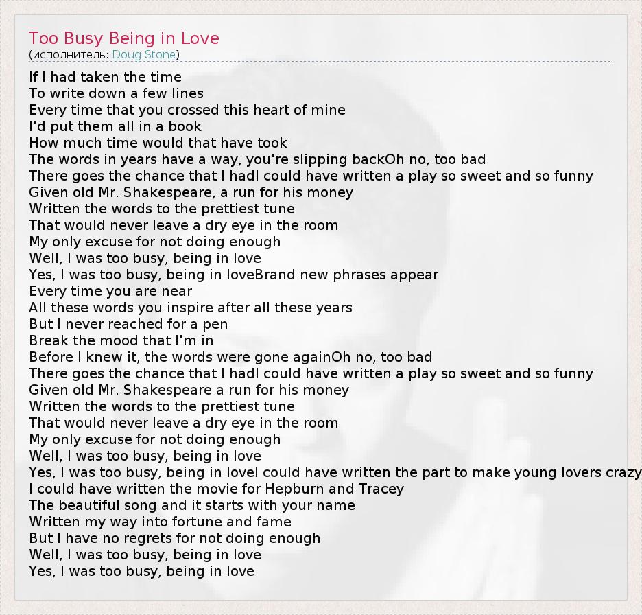 А как ты думаешь, о чем песня "Too Busy Being in Love" ?