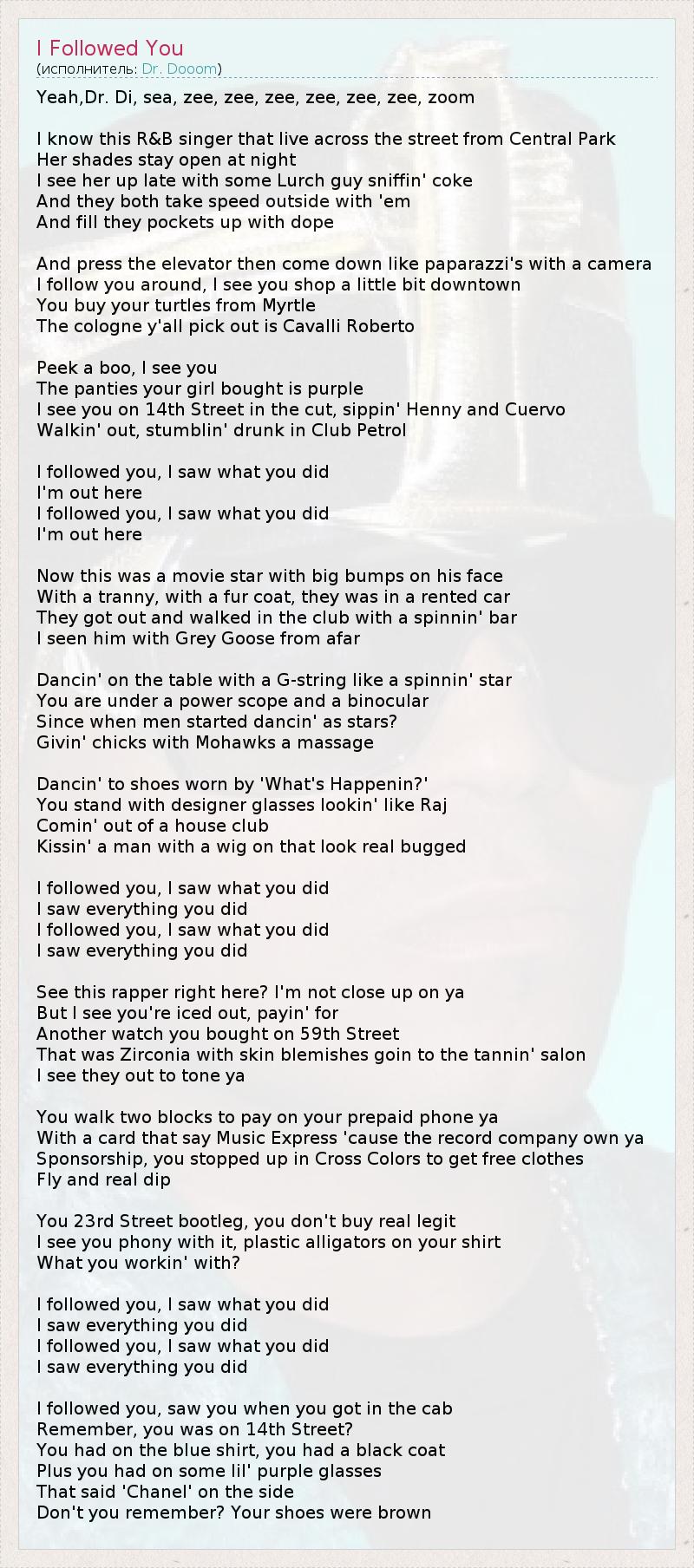 Yeah,Dr. Di, sea, zee, zee, zee, zee, zee, zee, zoom I know this R&B singer that live across the street from Central Park Her shades stay open at night I see her up late with some Lurch guy sniffin' coke And they both take speed outside with 'em And fill they pockets up with dope And press the elevator then come down like paparazzi's with a camera I follow you around, I see you shop a little bit downtown You buy your turtles from Myrtle The cologne y'all pick out is Cavalli Roberto Peek a boo, I see you The panties your girl bought is purple I see you on 14th Street in the cut, sippin' Henny and Cuervo Walkin' out, stumblin' drunk in Club Petrol I followed you, I saw what you did I'm out here I followed you, I saw what you did I'm out here Now this was a movie star with big bumps on his face With a tranny, with a fur coat, they was in a rented car They got out and walked in the club with a spinnin' bar I seen him with Grey Goose from afar Dancin' on the table with a G-string like a spinnin' star You are under a power scope and a binocular Since when men started dancin' as stars? Givin' chicks with Mohawks a massage Dancin' to shoes worn by 'What's Happenin?' You stand with designer glasses lookin' like Raj Comin' out of a house club Kissin' a man with a wig on that look real bugged I followed you, I saw what you did I saw everything you did I followed you, I saw what you did I saw everything you did See this rapper right here? I'm not close up on ya But I see you're iced out, payin' for Another watch you bought on 59th Street That was Zirconia with skin blemishes goin to the tannin' salon I see they out to tone ya You walk two blocks to pay on your prepaid phone ya With a card that say Music Express 'cause the record company own ya Sponsorship, you stopped up in Cross Colors to get free clothes Fly and real dip You 23rd Street bootleg, you don't buy real legit I see you phony with it, plastic alligators on your shirt What you workin' with? I followed you, I saw what you did I saw everything you did I followed you, I saw what you did I saw everything you did I followed you, saw you when you got in the cab Remember, you was on 14th Street? You had on the blue shirt, you had a black coat Plus you had on some lil' purple glasses That said 'Chanel' on the side Don't you remember? Your shoes were brown