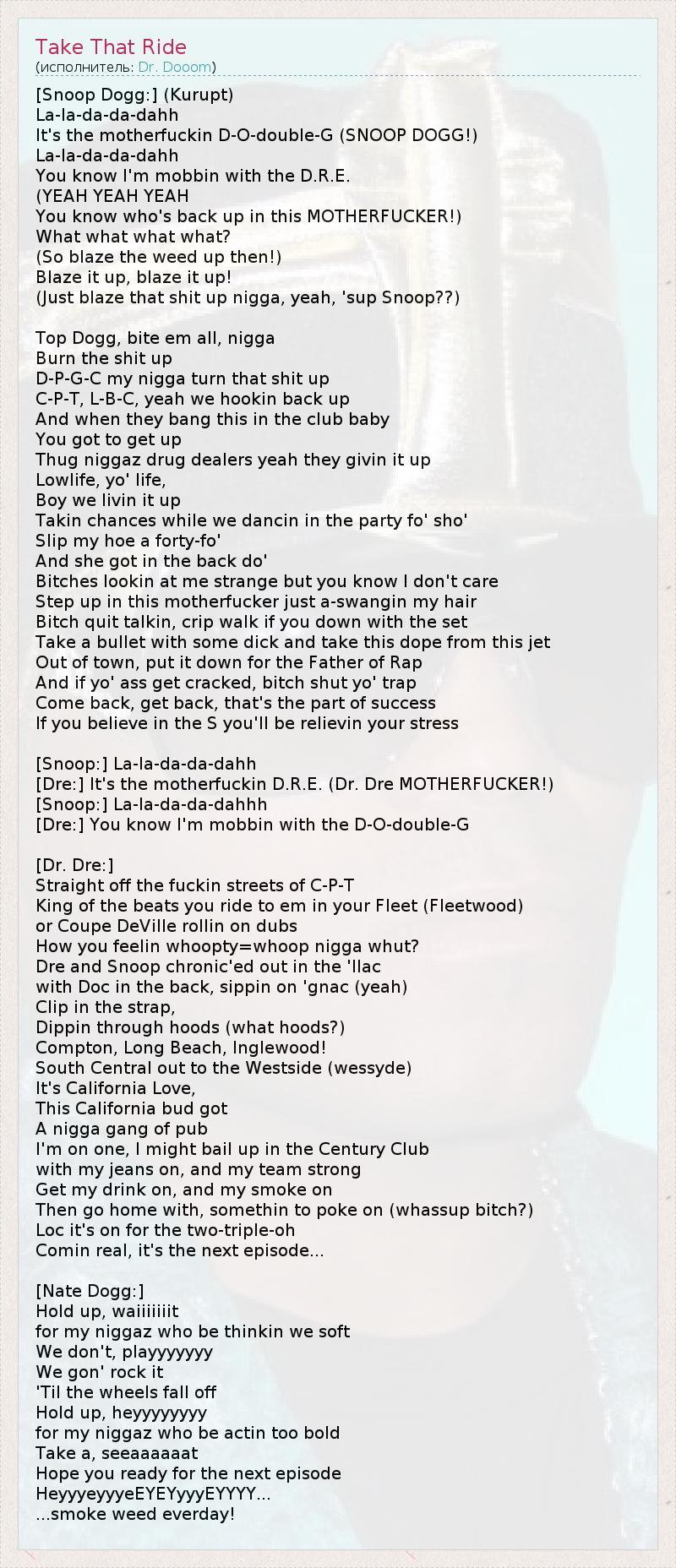 [Snoop Dogg:] (Kurupt) Ла-ла-да-да-даа, Это охренительный D-О-G-G (SNOOP DOGG!) Ла-ла-да-да-даа, Ты знаешь, что я тусуюсь 1 с D.R.E. (Да, да, да, Ты знаешь, кто подписывается за этого чувака!) Что, что, что, что? (В таком случае раскури дурь!) Раскуривай, раскуривай! (Просто раскуривай эту шнягу, нигер, да! Ну как, Snoop?) Самый главный Dogg, сделай их всех, нигер, Запали классную дурь, D-P-G-C 2, мой брат нигер, передай этот косячок, C-P-T 3, L-B-C 4, да, мы друг за друга горой, И когда они оттягиваются с дурью в клубе, детка, Тебе нужно расслабиться, Гангста-нигеры, наркодилеры, да, они расслабляются, Скудная жизнь, твоё существование, Мальчик, мы же полностью наслаждаемся 5 жизнью, Воспользуйся шансами, пока мы танцуем на вечеринке, точняк! Присунь моей шлюшке 44-колибровую пушку И она отхватит в задний проход, Суч*и пялятся на меня как-то странно, но ты знаешь, мне наплевать, Ввязывайся в это, придурок, я только помашу головой, Сучка, хватит болтать, танцуй crip 6, если ты в теме, Прими чек с кокаином вместе с чл*ном и получи свою дозу кетамина 7, Деревенщина, пресмыкайся перед Богом Рэпа, И если твоя задница была оприходованна 8, суч*ка, закрой свой рот, Возращайся, обратно сюда, это часть успеха, Если ты веришь в S, ты получишь облегчение от своего стресса. [Snoop:] Ла-ла-да-да-даа, [Dre:] Это охренительный D.R.E. (Dr. Dre, твою мать!) [Snoop:] Ла-ла-да-да-даа, [Dre:] Ты знаешь, что я тусуюсь с D-O-G-G. [Dr. Dre:] Любимые 9 охренительные улицы C-P-T 3, Король ритма, ты едешь к ним на своём Флитвуде 10 (Fleetwood), Или на Coupe DeVille 10 с 20 дюймовыми колёсами, Как ты себя чувствуешь, "бип-бип", нигер, чего? Dre и Snoop постоянно разъезжают в кадиллаке, Doc на заднем сиденье потягивает коньячок (да!) Патроны в пистолете, Углубляюсь в негритянские районы (какие негритянские районы?) Compton, Long Beach, Inglewood! Из South Central выезжаем в Westside (Весссайд). Это Калифорнийская любовь 11, Эту калифорнийскую марихуану предпочитает Банда нигеров публичного дома, Я под кайфом 12, я могу зажечь в Центральном Клубе, Одетый в джинсы, со своей сильной командой, Беру свою выпивку и свои косяки, Потом я иду домой потра*аться (что не так, суч*ка?) Запираюсь там с двумя-тремя-ох, Будет круто, это следующая серия... [Nate Dogg:] Тормози, подождиии Моих нигеров; кто считает, что мы слабоумные? Мы не шутиииим, Мы собираемся клубиться, До тех пор пока колёса тачки не отвалятся, Тормози, попривееетсвуй Моих нигеров; кто поступает слишком нагло! Присядь-ка! Надеюсь, ты готов для следующей серии! Пр-и-и-в-е-е-т! ... кури травку каждый день! 1 - mobbin - ехать или идти куда-нибудь большой группой, тусить. 2 - D-P-G-C - Dogg Pound Gangsta Clique - слан, состоящий из Snoop Dogg, Daz Dillinger, Kurupt, Nate Dogg, Soopafly и других. 3 - C-P-T - Compton, California - Комптон, штат Калифорния. 4 - L-B-C - Long Beach City - Лонг Бич, штат Калифорния. 5 - livin it up - расслабляться, отдыхать, наслаждаться жизнью. 6 - Crips - уличная банда, преступное сообщество в США, состоящее преимущественно из афроамериканцев. Для того, чтобы вступить в банду, парню нужно совершить преступление при свидетелях, а девушке вступить в половое сношение со старшими членами банды. В среде банды также возник знаменитый танец C-walk. 7 - jet - сленг. Название наркотика кетамина. 8 - get cracked - работать над чем-либо. 9 - Straight off - то, что очень нравится, что-то хорошее. 10 - Fleet, Coupe DeVille - модель кадиллака. 11 - California Love - известная песня 2Pac и Dr.Dre. 12 - on one - находиться под действием метамфетаминов