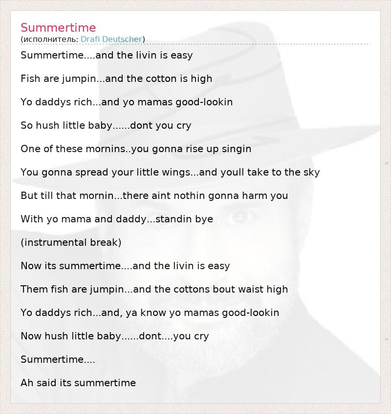 Summertime....and the livin is easy Fish are jumpin...and the cotton is high Yo daddys rich...and yo mamas good-lookin So hush little baby......dont you cry One of these mornins..you gonna rise up singin You gonna spread your little wings...and youll take to the sky But till that mornin...there aint nothin gonna harm you With yo mama and daddy...standin bye (instrumental break) Now its summertime....and the livin is easy Them fish are jumpin...and the cottons bout waist high Yo daddys rich...and, ya know yo mamas good-lookin Now hush little baby......dont....you cry Summertime.... Ah said its summertime