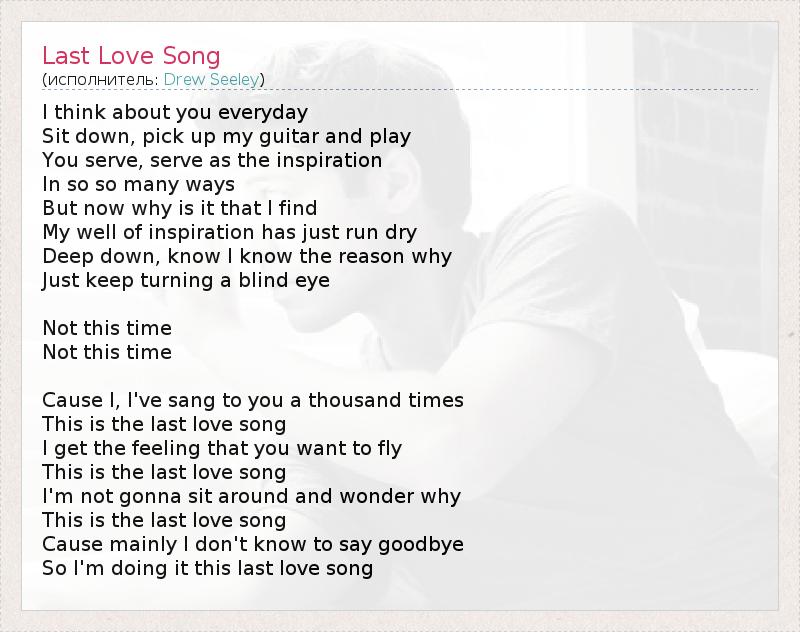 I think about you everyday Sit down, pick up my guitar and play You serve, serve as the inspiration In so so many ways But now why is it that I find My well of inspiration has just run dry Deep down, know I know the reason why Just keep turning a blind eye Not this time Not this time Cause I, I've sang to you a thousand times This is the last love song I get the feeling that you want to fly This is the last love song I'm not gonna sit around and wonder why This is the last love song Cause mainly I don't know to say goodbye So I'm doing it this last love song