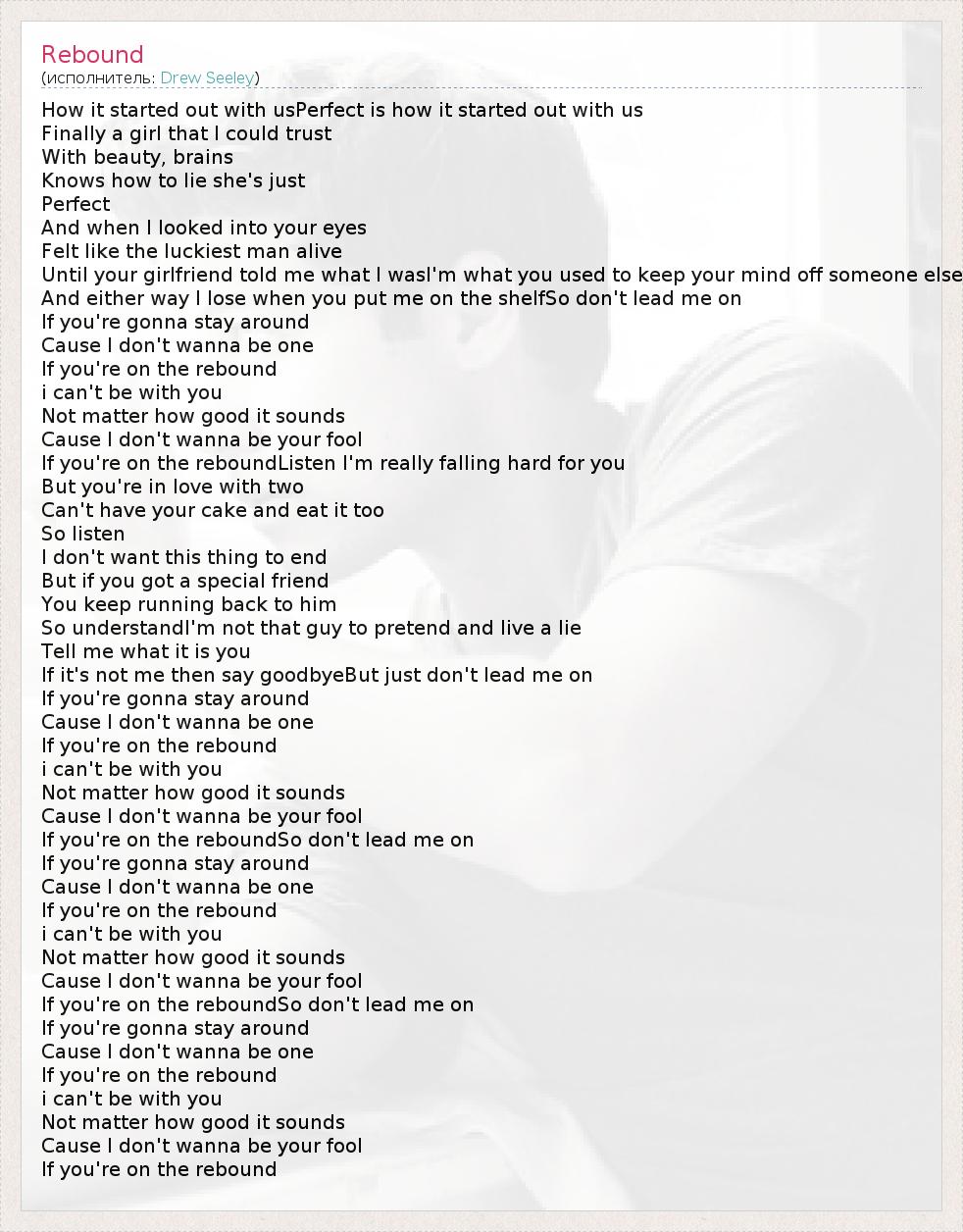 How it started out with usPerfect is how it started out with us Finally a girl that I could trust With beauty, brains Knows how to lie she's just Perfect And when I looked into your eyes Felt like the luckiest man alive Until your girlfriend told me what I wasI'm what you used to keep your mind off someone else And either way I lose when you put me on the shelfSo don't lead me on If you're gonna stay around Cause I don't wanna be one If you're on the rebound i can't be with you Not matter how good it sounds Cause I don't wanna be your fool If you're on the reboundListen I'm really falling hard for you But you're in love with two Can't have your cake and eat it too So listen I don't want this thing to end But if you got a special friend You keep running back to him So understandI'm not that guy to pretend and live a lie Tell me what it is you If it's not me then say goodbyeBut just don't lead me on If you're gonna stay around Cause I don't wanna be one If you're on the rebound i can't be with you Not matter how good it sounds Cause I don't wanna be your fool If you're on the reboundSo don't lead me on If you're gonna stay around Cause I don't wanna be one If you're on the rebound i can't be with you Not matter how good it sounds Cause I don't wanna be your fool If you're on the reboundSo don't lead me on If you're gonna stay around Cause I don't wanna be one If you're on the rebound i can't be with you Not matter how good it sounds Cause I don't wanna be your fool If you're on the rebound