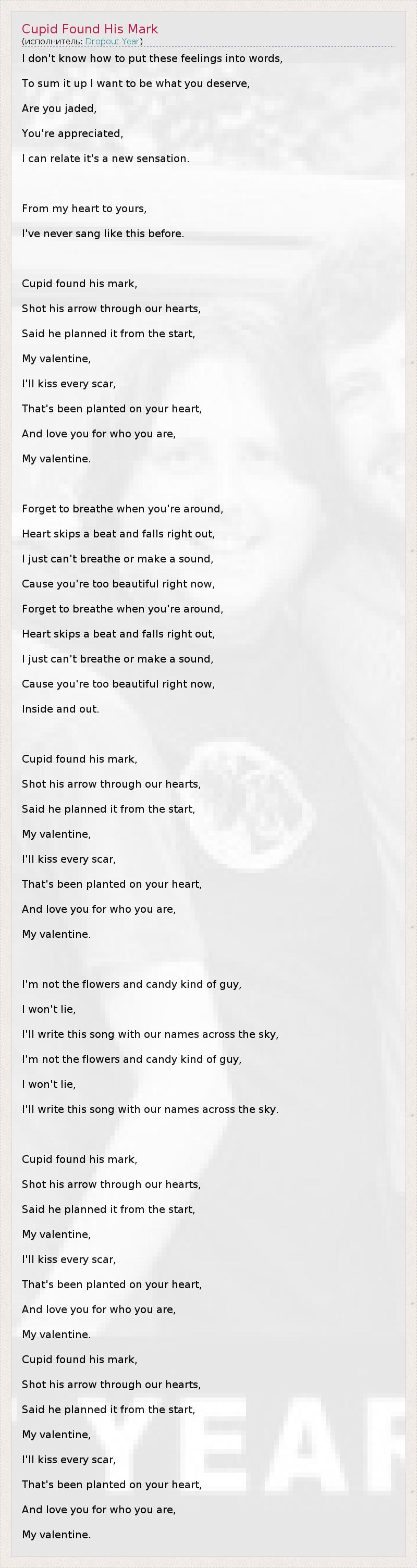 I don't know how to put these feelings into words, To sum it up I want to be what you deserve, Are you jaded, You're appreciated, I can relate it's a new sensation. From my heart to yours, I've never sang like this before. Cupid found his mark, Shot his arrow through our hearts, Said he planned it from the start, My valentine, I'll kiss every scar, That's been planted on your heart, And love you for who you are, My valentine. Forget to breathe when you're around, Heart skips a beat and falls right out, I just can't breathe or make a sound, Cause you're too beautiful right now, Forget to breathe when you're around, Heart skips a beat and falls right out, I just can't breathe or make a sound, Cause you're too beautiful right now, Inside and out. Cupid found his mark, Shot his arrow through our hearts, Said he planned it from the start, My valentine, I'll kiss every scar, That's been planted on your heart, And love you for who you are, My valentine. I'm not the flowers and candy kind of guy, I won't lie, I'll write this song with our names across the sky, I'm not the flowers and candy kind of guy, I won't lie, I'll write this song with our names across the sky. Cupid found his mark, Shot his arrow through our hearts, Said he planned it from the start, My valentine, I'll kiss every scar, That's been planted on your heart, And love you for who you are, My valentine. Cupid found his mark, Shot his arrow through our hearts, Said he planned it from the start, My valentine, I'll kiss every scar, That's been planted on your heart, And love you for who you are, My valentine.