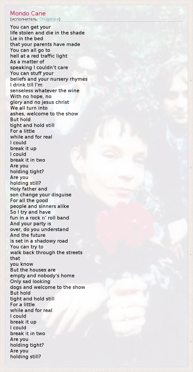 Это интересно:Drugstore are a London-based alternative and dream pop band led by Brazilian singer-songwriter and bassist Isabel Monteiro (b. São Paulo, Brazil), who relocated to England in 1990s, with Dave Hunter (later replaced by Daron Robinson) on guitar and Mike Chylinski on drums. The band's name is taken from the 1989 Gus Van Sant film, Drugstore Cowboy.The band was formed in 1993 by Monteiro, Hunter and Chylinski. Shortly before the release of their first single "Alive” in 1994, Hunter was replaced by Daron Robinson. Soon after this, the band signed a major record deal with Go! Discs. A number of singles earned them Single Of The Week awards, as Drugstore's rise continued. The band... продолжение