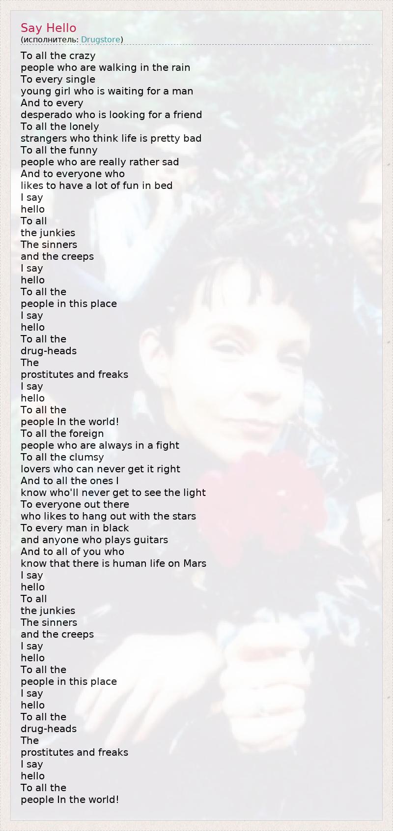 To all the crazy people who are walking in the rain To every single young girl who is waiting for a man And to every desperado who is looking for a friend To all the lonely strangers who think life is pretty bad To all the funny people who are really rather sad And to everyone who likes to have a lot of fun in bed I say hello To all the junkies The sinners and the creeps I say hello To all the people in this place I say hello To all the drug-heads The prostitutes and freaks I say hello To all the people In the world! To all the foreign people who are always in a fight To all the clumsy lovers who can never get it right And to all the ones I know who'll never get to see the light To everyone out there who likes to hang out with the stars To every man in black and anyone who plays guitars And to all of you who know that there is human life on Mars I say hello To all the junkies The sinners and the creeps I say hello To all the people in this place I say hello To all the drug-heads The prostitutes and freaks I say hello To all the people In the world!