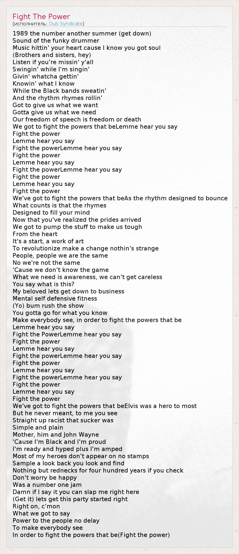 1989 the number another summer (get down) Sound of the funky drummer Music hittin' your heart cause I know you got soul (Brothers and sisters, hey) Listen if you're missin' y'all Swingin' while I'm singin' Givin' whatcha gettin' Knowin' what I know While the Black bands sweatin' And the rhythm rhymes rollin' Got to give us what we want Gotta give us what we need Our freedom of speech is freedom or death We got to fight the powers that beLemme hear you say Fight the power Lemme hear you say Fight the powerLemme hear you say Fight the power Lemme hear you say Fight the powerLemme hear you say Fight the power Lemme hear you say Fight the power We've got to fight the powers that beAs the rhythm designed to bounce What counts is that the rhymes Designed to fill your mind Now that you've realized the prides arrived We got to pump the stuff to make us tough From the heart It's a start, a work of art To revolutionize make a change nothin's strange People, people we are the same No we're not the same 'Cause we don't know the game What we need is awareness, we can't get careless You say what is this? My beloved lets get down to business Mental self defensive fitness (Yo) bum rush the show You gotta go for what you know Make everybody see, in order to fight the powers that be Lemme hear you say Fight the PowerLemme hear you say Fight the power Lemme hear you say Fight the powerLemme hear you say Fight the power Lemme hear you say Fight the powerLemme hear you say Fight the power Lemme hear you say Fight the power We've got to fight the powers that beElvis was a hero to most But he never meant, to me you see Straight up racist that sucker was Simple and plain Mother, him and John Wayne 'Cause I'm Black and I'm proud I'm ready and hyped plus I'm amped Most of my heroes don't appear on no stamps Sample a look back you look and find Nothing but rednecks for four hundred years if you check Don't worry be happy Was a number one jam Damn if I say it you can slap me right here (Get it) lets get this party started right Right on, c'mon What we got to say Power to the people no delay To make everybody see In order to fight the powers that be(Fight the power)