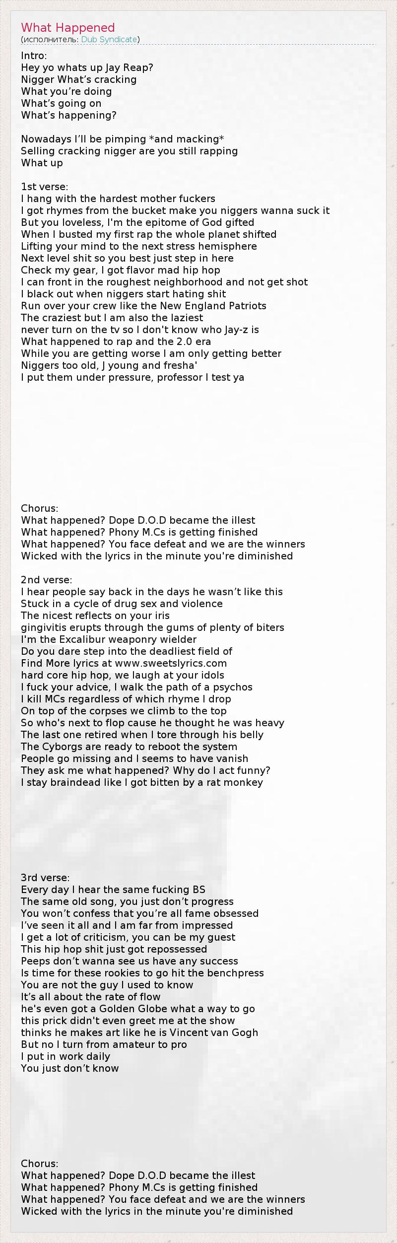 Intro: Hey yo whats up Jay Reap? Nigger What’s cracking What you’re doing What’s going on What’s happening? Nowadays I’ll be pimping *and macking* Selling cracking nigger are you still rapping What up 1st verse: I hang with the hardest mother fuckers I got rhymes from the bucket make you niggers wanna suck it But you loveless, I'm the epitome of God gifted When I busted my first rap the whole planet shifted Lifting your mind to the next stress hemisphere Next level shit so you best just step in here Check my gear, I got flavor mad hip hop I can front in the roughest neighborhood and not get shot I black out when niggers start hating shit Run over your crew like the New England Patriots The craziest but I am also the laziest never turn on the tv so I don't know who Jay-z is What happened to rap and the 2.0 era While you are getting worse I am only getting better Niggers too old, J young and fresha' I put them under pressure, professor I test ya Chorus: What happened? Dope D.O.D became the illest What happened? Phony M.Cs is getting finished What happened? You face defeat and we are the winners Wicked with the lyrics in the minute you're diminished 2nd verse: I hear people say back in the days he wasn’t like this Stuck in a cycle of drug sex and violence The nicest reflects on your iris gingivitis erupts through the gums of plenty of biters I'm the Excalibur weaponry wielder Do you dare step into the deadliest field of Find More lyrics at www.sweetslyrics.com hard core hip hop, we laugh at your idols I fuck your advice, I walk the path of a psychos I kill MCs regardless of which rhyme I drop On top of the corpses we climb to the top So who's next to flop cause he thought he was heavy The last one retired when I tore through his belly The Cyborgs are ready to reboot the system People go missing and I seems to have vanish They ask me what happened? Why do I act funny? I stay braindead like I got bitten by a rat monkey 3rd verse: Every day I hear the same fucking BS The same old song, you just don’t progress You won’t confess that you’re all fame obsessed I’ve seen it all and I am far from impressed I get a lot of criticism, you can be my guest This hip hop shit just got repossessed Peeps don’t wanna see us have any success Is time for these rookies to go hit the benchpress You are not the guy I used to know It’s all about the rate of flow he's even got a Golden Globe what a way to go this prick didn't even greet me at the show thinks he makes art like he is Vincent van Gogh But no I turn from amateur to pro I put in work daily You just don’t know Chorus: What happened? Dope D.O.D became the illest What happened? Phony M.Cs is getting finished What happened? You face defeat and we are the winners Wicked with the lyrics in the minute you're diminished