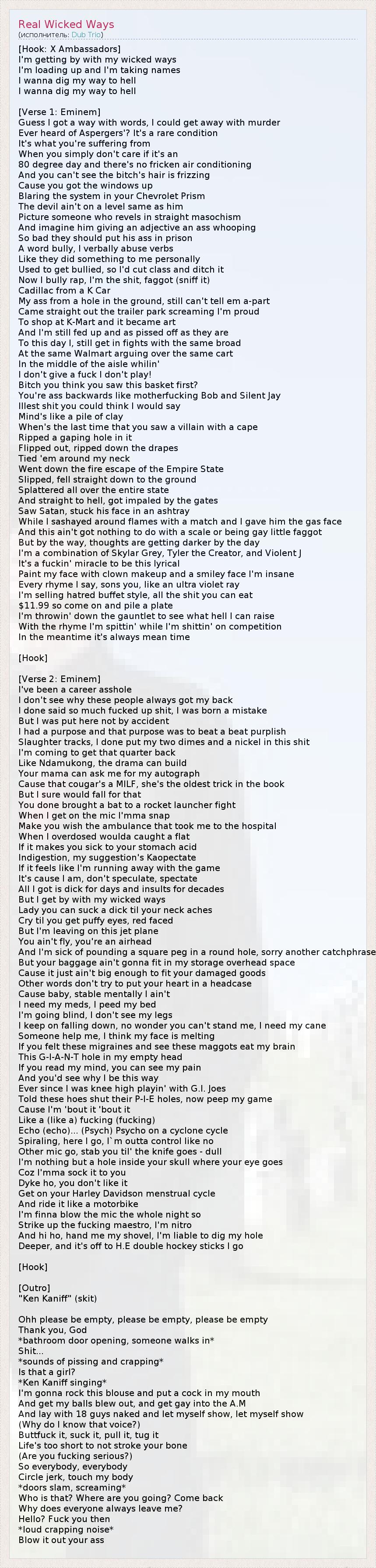 [Hook: X Ambassadors] I'm getting by with my wicked ways I'm loading up and I'm taking names I wanna dig my way to hell I wanna dig my way to hell [Verse 1: Eminem] Guess I got a way with words, I could get away with murder Ever heard of Aspergers'? It's a rare condition It's what you're suffering from When you simply don't care if it's an 80 degree day and there's no fricken air conditioning And you can't see the bitch's hair is frizzing Cause you got the windows up Blaring the system in your Chevrolet Prism The devil ain't on a level same as him Picture someone who revels in straight masochism And imagine him giving an adjective an ass whooping So bad they should put his ass in prison A word bully, I verbally abuse verbs Like they did something to me personally Used to get bullied, so I'd cut class and ditch it Now I bully rap, I'm the shit, faggot (sniff it) Cadillac from a K Car My ass from a hole in the ground, still can't tell em a-part Came straight out the trailer park screaming I'm proud To shop at K-Mart and it became art And I'm still fed up and as pissed off as they are To this day I, still get in fights with the same broad At the same Walmart arguing over the same cart In the middle of the aisle whilin' I don't give a fuck I don't play! Bitch you think you saw this basket first? You're ass backwards like motherfucking Bob and Silent Jay Illest shit you could think I would say Mind's like a pile of clay When's the last time that you saw a villain with a cape Ripped a gaping hole in it Flipped out, ripped down the drapes Tied 'em around my neck Went down the fire escape of the Empire State Slipped, fell straight down to the ground Splattered all over the entire state And straight to hell, got impaled by the gates Saw Satan, stuck his face in an ashtray While I sashayed around flames with a match and I gave him the gas face And this ain't got nothing to do with a scale or being gay little faggot But by the way, thoughts are getting darker by the day I'm a combination of Skylar Grey, Tyler the Creator, and Violent J It's a fuckin' miracle to be this lyrical Paint my face with clown makeup and a smiley face I'm insane Every rhyme I say, sons you, like an ultra violet ray I'm selling hatred buffet style, all the shit you can eat $11.99 so come on and pile a plate I'm throwin' down the gauntlet to see what hell I can raise With the rhyme I'm spittin' while I'm shittin' on competition In the meantime it's always mean time [Hook] [Verse 2: Eminem] I've been a career asshole I don't see why these people always got my back I done said so much fucked up shit, I was born a mistake But I was put here not by accident I had a purpose and that purpose was to beat a beat purplish Slaughter tracks, I done put my two dimes and a nickel in this shit I'm coming to get that quarter back Like Ndamukong, the drama can build Your mama can ask me for my autograph Cause that cougar's a MILF, she's the oldest trick in the book But I sure would fall for that You done brought a bat to a rocket launcher fight When I get on the mic I'mma snap Make you wish the ambulance that took me to the hospital When I overdosed woulda caught a flat If it makes you sick to your stomach acid Indigestion, my suggestion's Kaopectate If it feels like I'm running away with the game It's cause I am, don't speculate, spectate All I got is dick for days and insults for decades But I get by with my wicked ways Lady you can suck a dick til your neck aches Cry til you get puffy eyes, red faced But I'm leaving on this jet plane You ain't fly, you're an airhead And I'm sick of pounding a square peg in a round hole, sorry another catchphrase But your baggage ain't gonna fit in my storage overhead space Cause it just ain't big enough to fit your damaged goods Other words don't try to put your heart in a headcase Cause baby, stable mentally I ain't I need my meds, I peed my bed I'm going blind, I don't see my legs I keep on falling down, no wonder you can't stand me, I need my cane Someone help me, I think my face is melting If you felt these migraines and see these maggots eat my brain This G-I-A-N-T hole in my empty head If you read my mind, you can see my pain And you'd see why I be this way Ever since I was knee high playin' with G.I. Joes Told these hoes shut their P-I-E holes, now peep my game Cause I'm 'bout it 'bout it Like a (like a) fucking (fucking) Echo (echo)... (Psych) Psycho on a cyclone cycle Spiraling, here I go, I`m outta control like no Other mic go, stab you til' the knife goes - dull I'm nothing but a hole inside your skull where your eye goes Coz I'mma sock it to you Dyke ho, you don't like it Get on your Harley Davidson menstrual cycle And ride it like a motorbike I'm finna blow the mic the whole night so Strike up the fucking maestro, I'm nitro And hi ho, hand me my shovel, I'm liable to dig my hole Deeper, and it's off to H.E double hockey sticks I go [Hook] [Outro] "Ken Kaniff" (skit) Ohh please be empty, please be empty, please be empty Thank you, God *bathroom door opening, someone walks in* Shit... *sounds of pissing and crapping* Is that a girl? *Ken Kaniff singing* I'm gonna rock this blouse and put a cock in my mouth And get my balls blew out, and get gay into the A.M And lay with 18 guys naked and let myself show, let myself show (Why do I know that voice?) Buttfuck it, suck it, pull it, tug it Life's too short to not stroke your bone (Are you fucking serious?) So everybody, everybody Circle jerk, touch my body *doors slam, screaming* Who is that? Where are you going? Come back Why does everyone always leave me? Hello? Fuck you then *loud crapping noise* Blow it out your ass