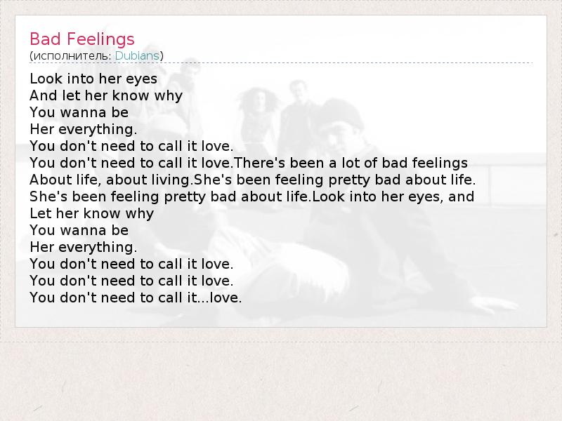 Look into her eyes And let her know why You wanna be Her everything. You don't need to call it love. You don't need to call it love.There's been a lot of bad feelings About life, about living.She's been feeling pretty bad about life. She's been feeling pretty bad about life.Look into her eyes, and Let her know why You wanna be Her everything. You don't need to call it love. You don't need to call it love. You don't need to call it...love.