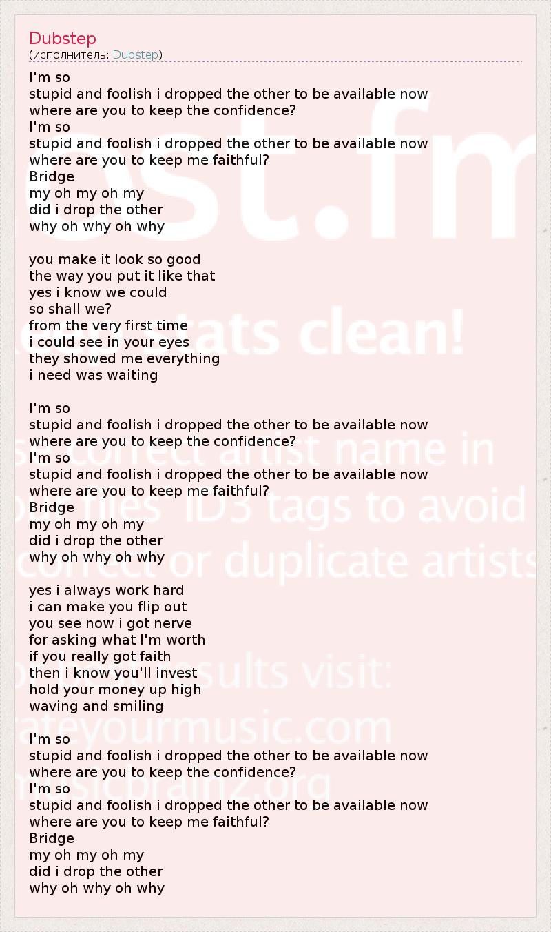 I'm so stupid and foolish i dropped the other to be available now where are you to keep the confidence? I'm so stupid and foolish i dropped the other to be available now where are you to keep me faithful? Bridge my oh my oh my did i drop the other why oh why oh why you make it look so good the way you put it like that yes i know we could so shall we? from the very first time i could see in your eyes they showed me everything i need was waiting I'm so stupid and foolish i dropped the other to be available now where are you to keep the confidence? I'm so stupid and foolish i dropped the other to be available now where are you to keep me faithful? Bridge my oh my oh my did i drop the other why oh why oh why yes i always work hard i can make you flip out you see now i got nerve for asking what I'm worth if you really got faith then i know you'll invest hold your money up high waving and smiling I'm so stupid and foolish i dropped the other to be available now where are you to keep the confidence? I'm so stupid and foolish i dropped the other to be available now where are you to keep me faithful? Bridge my oh my oh my did i drop the other why oh why oh why