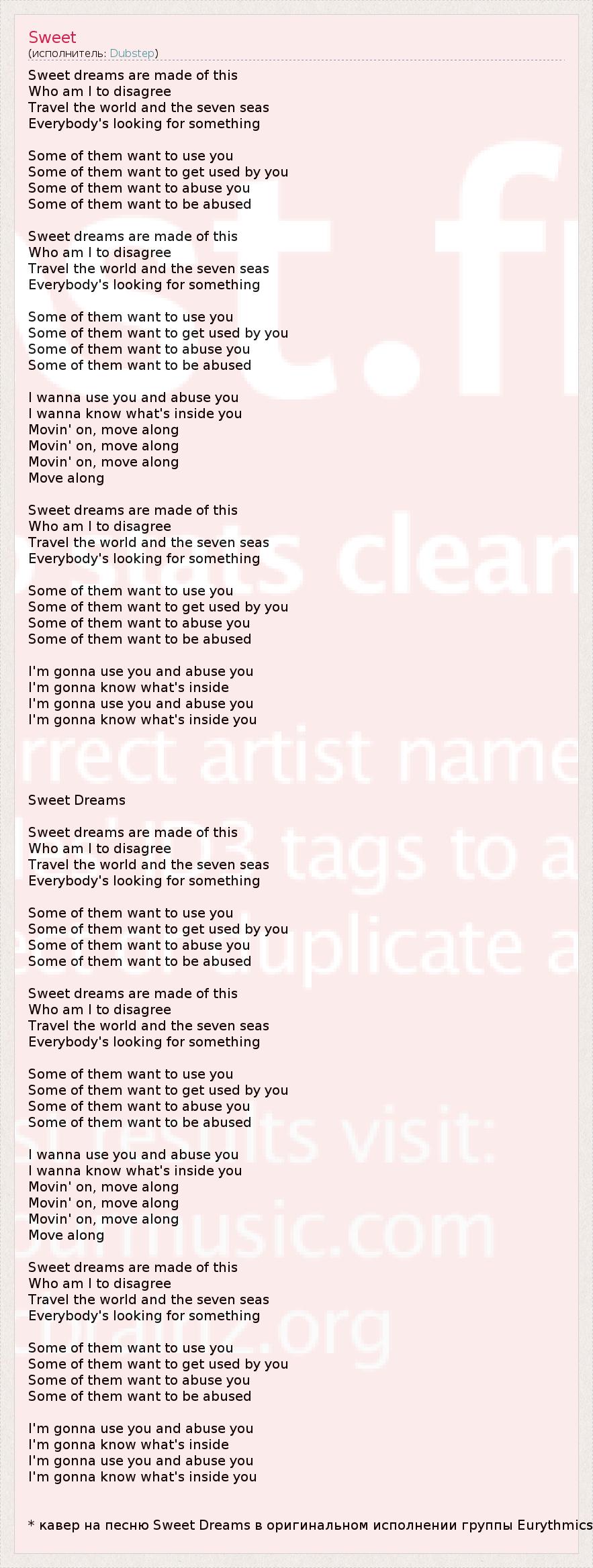 Sweet dreams are made of this Who am I to disagree Travel the world and the seven seas Everybody's looking for something Some of them want to use you Some of them want to get used by you Some of them want to abuse you Some of them want to be abused Sweet dreams are made of this Who am I to disagree Travel the world and the seven seas Everybody's looking for something Some of them want to use you Some of them want to get used by you Some of them want to abuse you Some of them want to be abused I wanna use you and abuse you I wanna know what's inside you Movin' on, move along Movin' on, move along Movin' on, move along Move along Sweet dreams are made of this Who am I to disagree Travel the world and the seven seas Everybody's looking for something Some of them want to use you Some of them want to get used by you Some of them want to abuse you Some of them want to be abused I'm gonna use you and abuse you I'm gonna know what's inside I'm gonna use you and abuse you I'm gonna know what's inside you Sweet Dreams Sweet dreams are made of this Who am I to disagree Travel the world and the seven seas Everybody's looking for something Some of them want to use you Some of them want to get used by you Some of them want to abuse you Some of them want to be abused Sweet dreams are made of this Who am I to disagree Travel the world and the seven seas Everybody's looking for something Some of them want to use you Some of them want to get used by you Some of them want to abuse you Some of them want to be abused I wanna use you and abuse you I wanna know what's inside you Movin' on, move along Movin' on, move along Movin' on, move along Move along Sweet dreams are made of this Who am I to disagree Travel the world and the seven seas Everybody's looking for something Some of them want to use you Some of them want to get used by you Some of them want to abuse you Some of them want to be abused I'm gonna use you and abuse you I'm gonna know what's inside I'm gonna use you and abuse you I'm gonna know what's inside you * кавер на песню Sweet Dreams в оригинальном исполнении группы Eurythmics