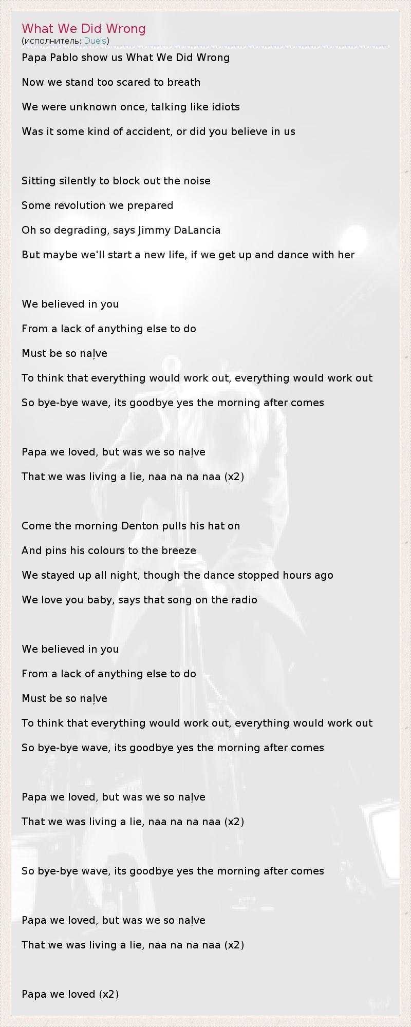 Papa Pablo show us What We Did Wrong Now we stand too scared to breath We were unknown once, talking like idiots Was it some kind of accident, or did you believe in us Sitting silently to block out the noise Some revolution we prepared Oh so degrading, says Jimmy DaLancia But maybe we'll start a new life, if we get up and dance with her We believed in you From a lack of anything else to do Must be so naļve To think that everything would work out, everything would work out So bye-bye wave, its goodbye yes the morning after comes Papa we loved, but was we so naļve That we was living a lie, naa na na naa (x2) Come the morning Denton pulls his hat on And pins his colours to the breeze We stayed up all night, though the dance stopped hours ago We love you baby, says that song on the radio We believed in you From a lack of anything else to do Must be so naļve To think that everything would work out, everything would work out So bye-bye wave, its goodbye yes the morning after comes Papa we loved, but was we so naļve That we was living a lie, naa na na naa (x2) So bye-bye wave, its goodbye yes the morning after comes Papa we loved, but was we so naļve That we was living a lie, naa na na naa (x2) Papa we loved (x2)