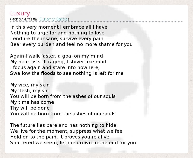 В этот самый момент я принимаю все, что у меня есть – Стремиться не к чему и нечего терять. Я смиряюсь с безумием, выдерживаю любую боль, Выношу любое бремя и больше не стыжусь тебя. Я вновь ускоряю шаг, в моем сознании – цель, Мое сердце бешено колотится, я дрожу как сумасшедший. Я вновь концентрируюсь и смотрю в никуда, Сдерживаю потоки чувств, чтобы понять – мне ничего не осталось. Мой порок, моя кожа, Моя плоть, мой грех, Ты появишься на свет из праха наших душ. Мое время настало, Твоя воля будет исполнена, Ты появишься на свет из праха наших душ. Будущее как на ладони и ничего не таит, Мы живем моментом, подавляя свои чувства. Держись за свою боль, она доказывает, что ты жив, Кажется, мы разбиты, позволь мне в конце концов утонуть за тебя .