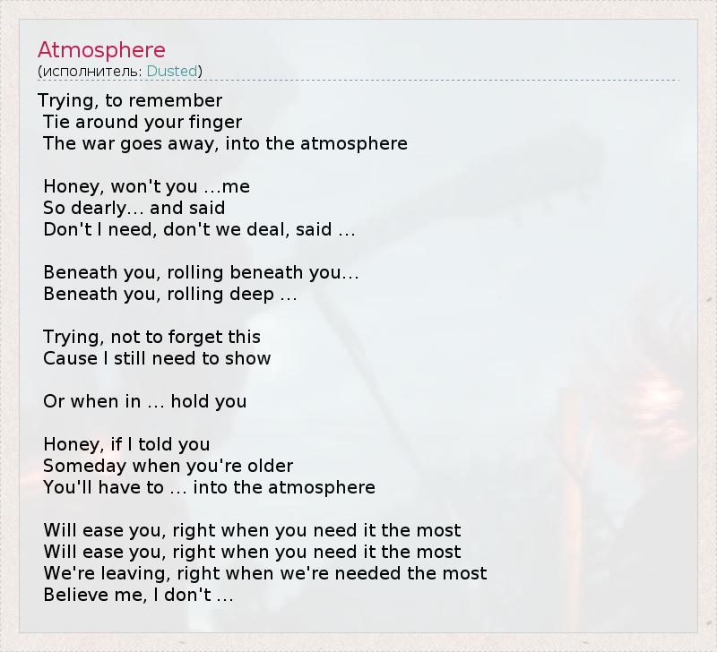 Trying, to remember Tie around your finger The war goes away, into the atmosphere Honey, won't you …me So dearly… and said Don't I need, don't we deal, said … Beneath you, rolling beneath you… Beneath you, rolling deep … Trying, not to forget this Cause I still need to show Or when in … hold you Honey, if I told you Someday when you're older You'll have to … into the atmosphere Will ease you, right when you need it the most Will ease you, right when you need it the most We're leaving, right when we're needed the most Believe me, I don't …