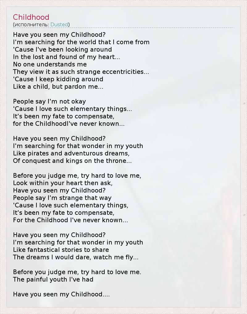 Have you seen my Childhood? I'm searching for the world that I come from 'Cause I've been looking around In the lost and found of my heart... No one understands me They view it as such strange eccentricities... 'Cause I keep kidding around Like a child, but pardon me... People say I'm not okay 'Cause I love such elementary things... It's been my fate to compensate, for the ChildhoodI've never known... Have you seen my Childhood? I'm searching for that wonder in my youth Like pirates and adventurous dreams, Of conquest and kings on the throne... Before you judge me, try hard to love me, Look within your heart then ask, Have you seen my Childhood? People say I'm strange that way 'Cause I love such elementary things, It's been my fate to compensate, For the Childhood I've never known... Have you seen my Childhood? I'm searching for that wonder in my youth Like fantastical stories to share The dreams I would dare, watch me fly... Before you judge me, try hard to love me. The painful youth I've had Have you seen my Childhood....