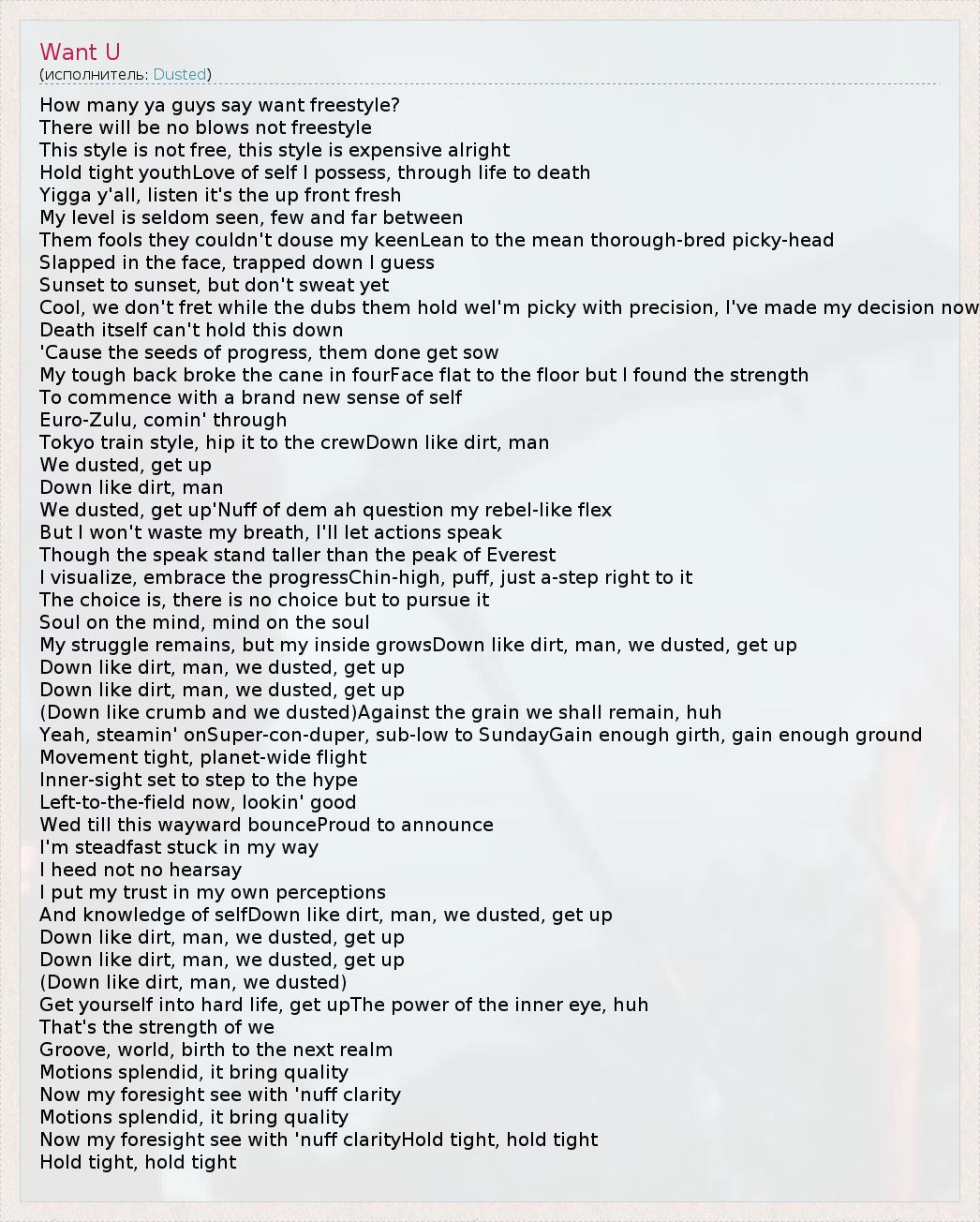 How many ya guys say want freestyle? There will be no blows not freestyle This style is not free, this style is expensive alright Hold tight youthLove of self I possess, through life to death Yigga y'all, listen it's the up front fresh My level is seldom seen, few and far between Them fools they couldn't douse my keenLean to the mean thorough-bred picky-head Slapped in the face, trapped down I guess Sunset to sunset, but don't sweat yet Cool, we don't fret while the dubs them hold weI'm picky with precision, I've made my decision now Death itself can't hold this down 'Cause the seeds of progress, them done get sow My tough back broke the cane in fourFace flat to the floor but I found the strength To commence with a brand new sense of self Euro-Zulu, comin' through Tokyo train style, hip it to the crewDown like dirt, man We dusted, get up Down like dirt, man We dusted, get up'Nuff of dem ah question my rebel-like flex But I won't waste my breath, I'll let actions speak Though the speak stand taller than the peak of Everest I visualize, embrace the progressChin-high, puff, just a-step right to it The choice is, there is no choice but to pursue it Soul on the mind, mind on the soul My struggle remains, but my inside growsDown like dirt, man, we dusted, get up Down like dirt, man, we dusted, get up Down like dirt, man, we dusted, get up (Down like crumb and we dusted)Against the grain we shall remain, huh Yeah, steamin' onSuper-con-duper, sub-low to SundayGain enough girth, gain enough ground Movement tight, planet-wide flight Inner-sight set to step to the hype Left-to-the-field now, lookin' good Wed till this wayward bounceProud to announce I'm steadfast stuck in my way I heed not no hearsay I put my trust in my own perceptions And knowledge of selfDown like dirt, man, we dusted, get up Down like dirt, man, we dusted, get up Down like dirt, man, we dusted, get up (Down like dirt, man, we dusted) Get yourself into hard life, get upThe power of the inner eye, huh That's the strength of we Groove, world, birth to the next realm Motions splendid, it bring quality Now my foresight see with 'nuff clarity Motions splendid, it bring quality Now my foresight see with 'nuff clarityHold tight, hold tight Hold tight, hold tight