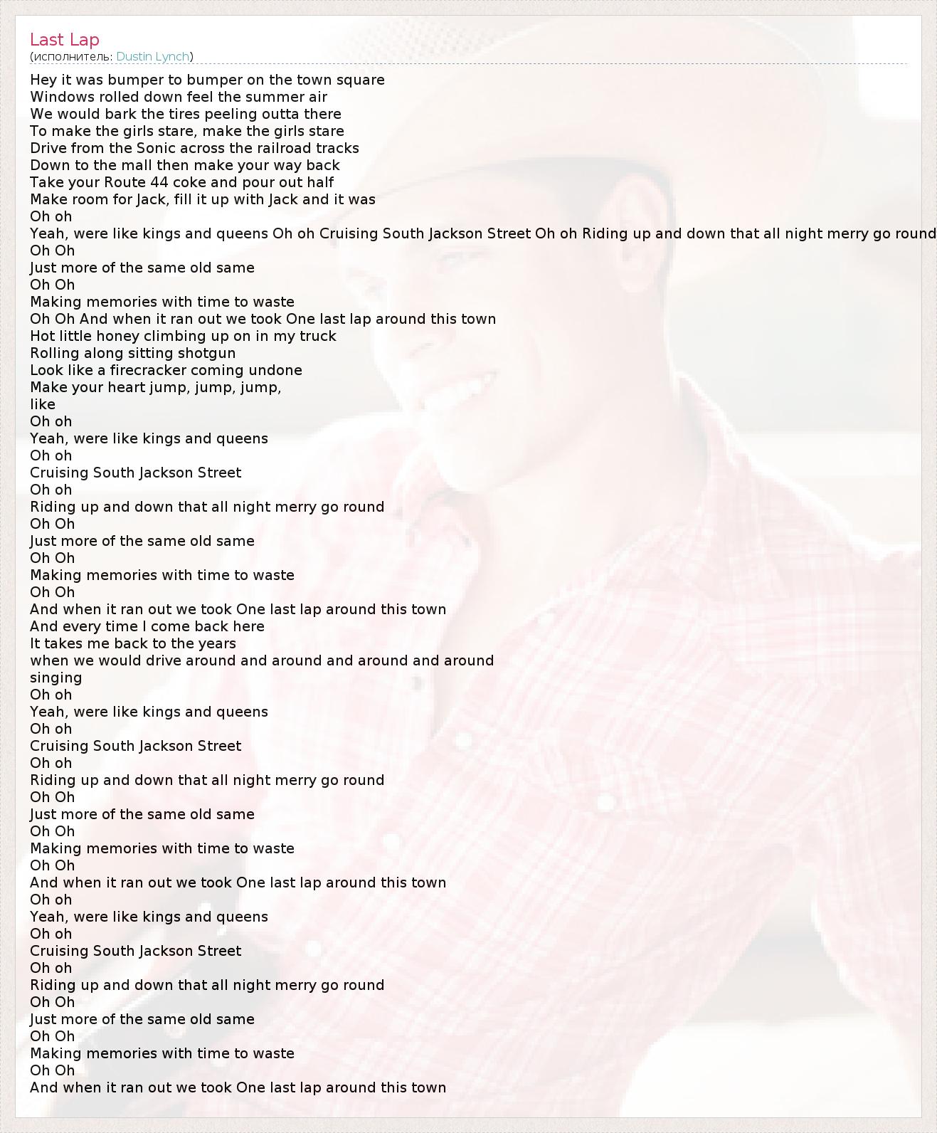 Hey it was bumper to bumper on the town square Windows rolled down feel the summer air We would bark the tires peeling outta there To make the girls stare, make the girls stare Drive from the Sonic across the railroad tracks Down to the mall then make your way back Take your Route 44 coke and pour out half Make room for Jack, fill it up with Jack and it was Oh oh Yeah, were like kings and queens Oh oh Cruising South Jackson Street Oh oh Riding up and down that all night merry go round Oh Oh Just more of the same old same Oh Oh Making memories with time to waste Oh Oh And when it ran out we took One last lap around this town Hot little honey climbing up on in my truck Rolling along sitting shotgun Look like a firecracker coming undone Make your heart jump, jump, jump, like Oh oh Yeah, were like kings and queens Oh oh Cruising South Jackson Street Oh oh Riding up and down that all night merry go round Oh Oh Just more of the same old same Oh Oh Making memories with time to waste Oh Oh And when it ran out we took One last lap around this town And every time I come back here It takes me back to the years when we would drive around and around and around and around singing Oh oh Yeah, were like kings and queens Oh oh Cruising South Jackson Street Oh oh Riding up and down that all night merry go round Oh Oh Just more of the same old same Oh Oh Making memories with time to waste Oh Oh And when it ran out we took One last lap around this town Oh oh Yeah, were like kings and queens Oh oh Cruising South Jackson Street Oh oh Riding up and down that all night merry go round Oh Oh Just more of the same old same Oh Oh Making memories with time to waste Oh Oh And when it ran out we took One last lap around this town