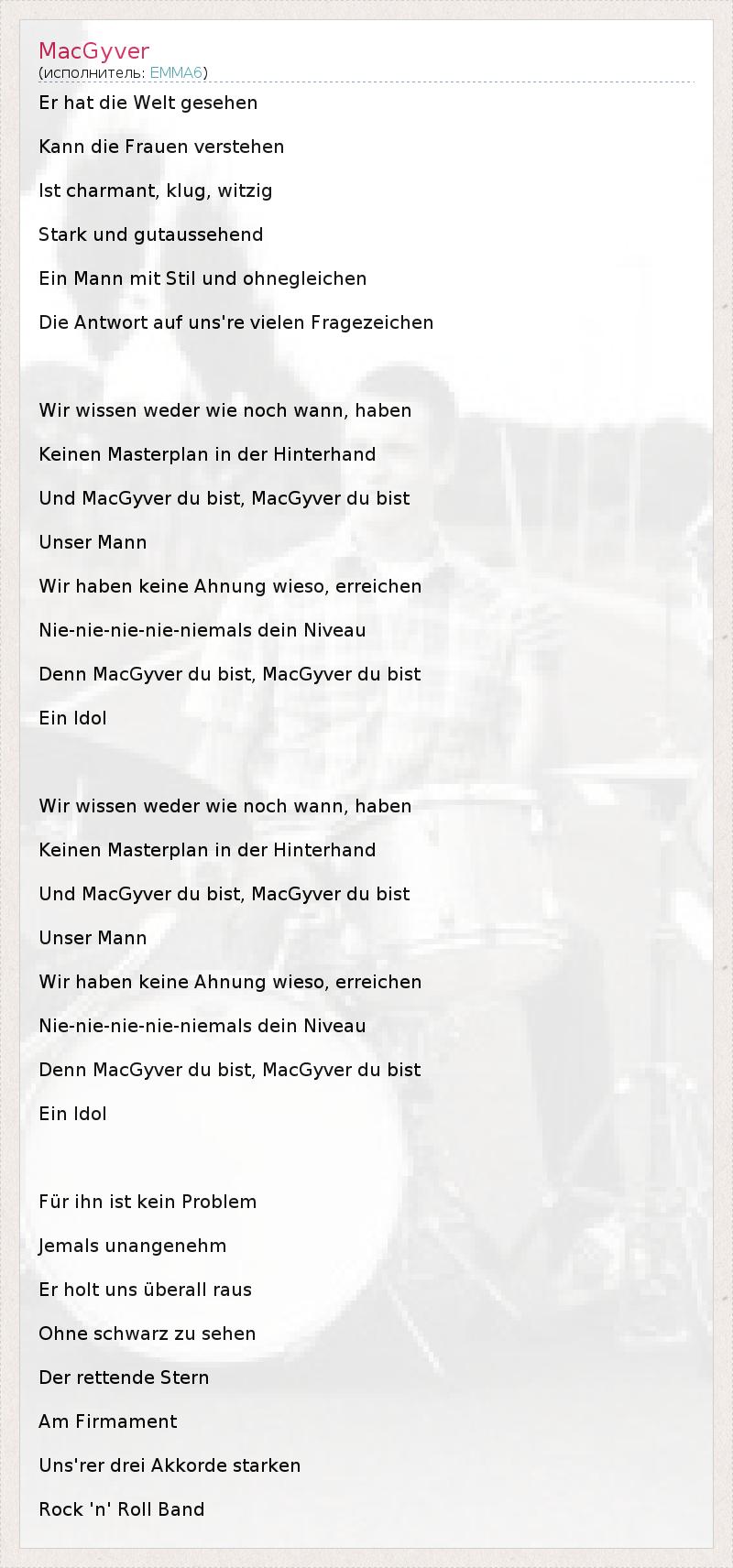 Er hat die Welt gesehen Kann die Frauen verstehen Ist charmant, klug, witzig Stark und gutaussehend Ein Mann mit Stil und ohnegleichen Die Antwort auf uns're vielen Fragezeichen Wir wissen weder wie noch wann, haben Keinen Masterplan in der Hinterhand Und MacGyver du bist, MacGyver du bist Unser Mann Wir haben keine Ahnung wieso, erreichen Nie-nie-nie-nie-niemals dein Niveau Denn MacGyver du bist, MacGyver du bist Ein Idol Wir wissen weder wie noch wann, haben Keinen Masterplan in der Hinterhand Und MacGyver du bist, MacGyver du bist Unser Mann Wir haben keine Ahnung wieso, erreichen Nie-nie-nie-nie-niemals dein Niveau Denn MacGyver du bist, MacGyver du bist Ein Idol Für ihn ist kein Problem Jemals unangenehm Er holt uns überall raus Ohne schwarz zu sehen Der rettende Stern Am Firmament Uns'rer drei Akkorde starken Rock 'n' Roll Band