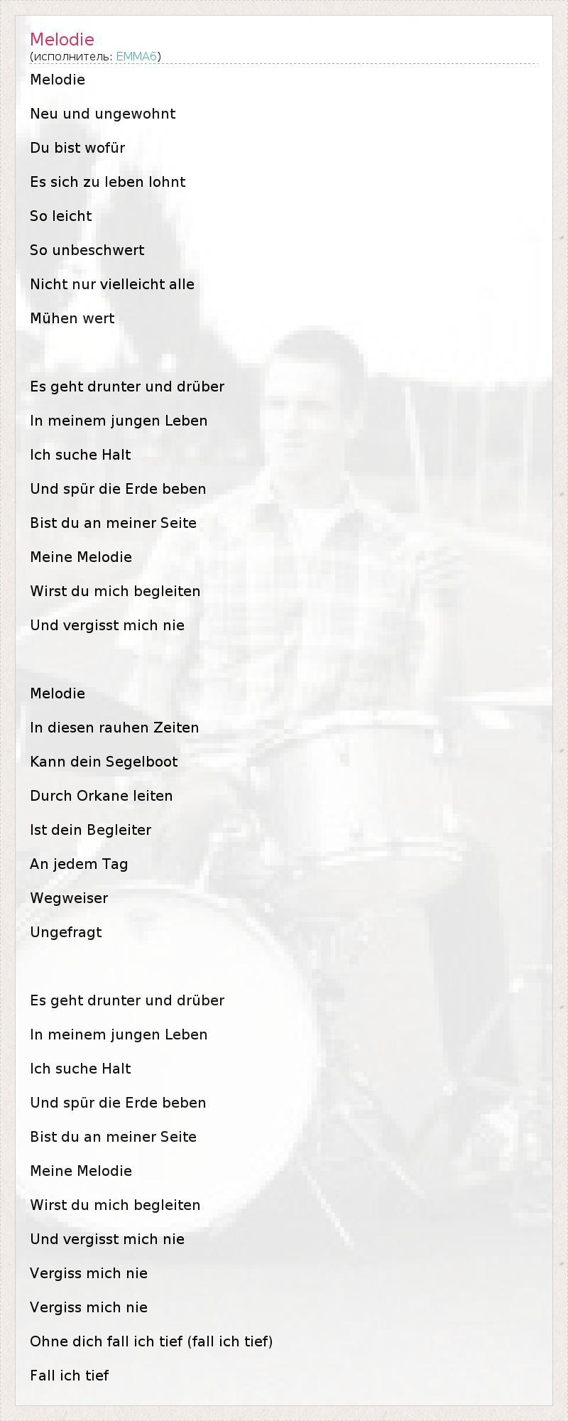 Melodie Neu und ungewohnt Du bist wofür Es sich zu leben lohnt So leicht So unbeschwert Nicht nur vielleicht alle Mühen wert Es geht drunter und drüber In meinem jungen Leben Ich suche Halt Und spür die Erde beben Bist du an meiner Seite Meine Melodie Wirst du mich begleiten Und vergisst mich nie Melodie In diesen rauhen Zeiten Kann dein Segelboot Durch Orkane leiten Ist dein Begleiter An jedem Tag Wegweiser Ungefragt Es geht drunter und drüber In meinem jungen Leben Ich suche Halt Und spür die Erde beben Bist du an meiner Seite Meine Melodie Wirst du mich begleiten Und vergisst mich nie Vergiss mich nie Vergiss mich nie Ohne dich fall ich tief (fall ich tief) Fall ich tief