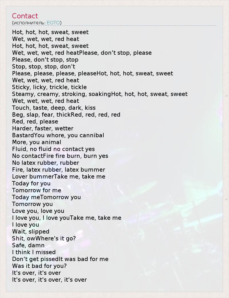 Hot, hot, hot, sweat, sweet Wet, wet, wet, red heat Hot, hot, hot, sweat, sweet Wet, wet, wet, red heatPlease, don't stop, please Please, don't stop, stop Stop, stop, stop, don't Please, please, please, pleaseHot, hot, hot, sweat, sweet Wet, wet, wet, red heat Sticky, licky, trickle, tickle Steamy, creamy, stroking, soakingHot, hot, hot, sweat, sweet Wet, wet, wet, red heat Touch, taste, deep, dark, kiss Beg, slap, fear, thickRed, red, red, red Red, red, please Harder, faster, wetter BastardYou whore, you cannibal More, you animal Fluid, no fluid no contact yes No contactFire fire burn, burn yes No latex rubber, rubber Fire, latex rubber, latex bummer Lover bummerTake me, take me Today for you Tomorrow for me Today meTomorrow you Tomorrow you Love you, love you I love you, I love youTake me, take me I love you Wait, slipped Shit, owWhere's it go? Safe, damn I think I missed Don't get pissedIt was bad for me Was it bad for you? It's over, it's over It's over, it's over, it's over