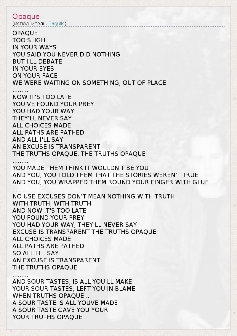OPAQUE TOO SLIGH IN YOUR WAYS YOU SAID YOU NEVER DID NOTHING BUT I'LL DEBATE IN YOUR EYES ON YOUR FACE WE WERE WAITING ON SOMETHING, OUT OF PLACE ......... NOW IT'S TOO LATE YOU'VE FOUND YOUR PREY YOU HAD YOUR WAY THEY'LL NEVER SAY ALL CHOICES MADE ALL PATHS ARE PATHED AND ALL I'LL SAY AN EXCUSE IS TRANSPARENT THE TRUTHS OPAQUE. THE TRUTHS OPAQUE ......... YOU MADE THEM THINK IT WOULDN'T BE YOU AND YOU, YOU TOLD THEM THAT THE STORIES WEREN'T TRUE AND YOU, YOU WRAPPED THEM ROUND YOUR FINGER WITH GLUE ......... NO USE EXCUSES DON'T MEAN NOTHING WITH TRUTH WITH TRUTH, WITH TRUTH AND NOW IT'S TOO LATE YOU FOUND YOUR PREY YOU HAD YOUR WAY, THEY'LL NEVER SAY EXCUSE IS TRANSPARENT THE TRUTHS OPAQUE ALL CHOICES MADE ALL PATHS ARE PATHED SO ALL I'LL SAY AN EXCUSE IS TRANSPARENT THE TRUTHS OPAQUE ......... AND SOUR TASTES, IS ALL YOU'LL MAKE YOUR SOUR TASTES, LEFT YOU IN BLAME WHEN TRUTHS OPAQUE... A SOUR TASTE IS ALL YOUVE MADE A SOUR TASTE GAVE YOU YOUR YOUR TRUTHS OPAQUE