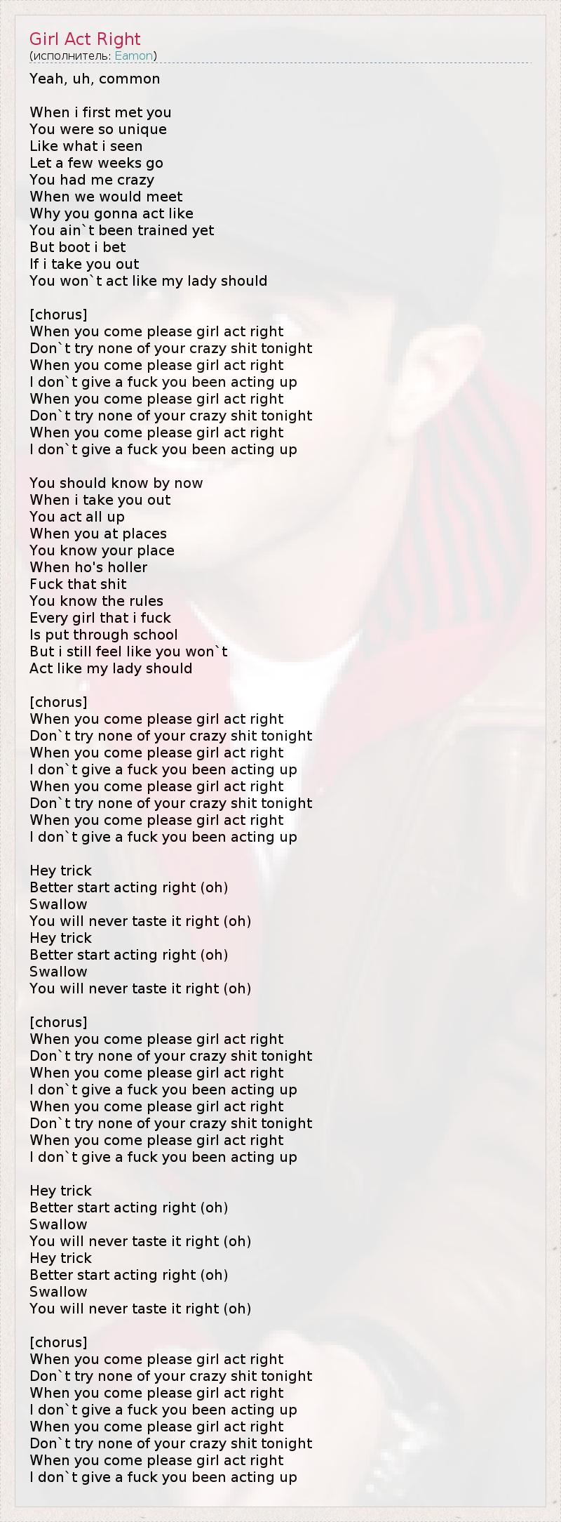 Yeah, uh, common When i first met you You were so unique Like what i seen Let a few weeks go You had me crazy When we would meet Why you gonna act like You ain`t been trained yet But boot i bet If i take you out You won`t act like my lady should [chorus] When you come please girl act right Don`t try none of your crazy shit tonight When you come please girl act right I don`t give a fuck you been acting up When you come please girl act right Don`t try none of your crazy shit tonight When you come please girl act right I don`t give a fuck you been acting up You should know by now When i take you out You act all up When you at places You know your place When ho's holler Fuck that shit You know the rules Every girl that i fuck Is put through school But i still feel like you won`t Act like my lady should [chorus] When you come please girl act right Don`t try none of your crazy shit tonight When you come please girl act right I don`t give a fuck you been acting up When you come please girl act right Don`t try none of your crazy shit tonight When you come please girl act right I don`t give a fuck you been acting up Hey trick Better start acting right (oh) Swallow You will never taste it right (oh) Hey trick Better start acting right (oh) Swallow You will never taste it right (oh) [chorus] When you come please girl act right Don`t try none of your crazy shit tonight When you come please girl act right I don`t give a fuck you been acting up When you come please girl act right Don`t try none of your crazy shit tonight When you come please girl act right I don`t give a fuck you been acting up Hey trick Better start acting right (oh) Swallow You will never taste it right (oh) Hey trick Better start acting right (oh) Swallow You will never taste it right (oh) [chorus] When you come please girl act right Don`t try none of your crazy shit tonight When you come please girl act right I don`t give a fuck you been acting up When you come please girl act right Don`t try none of your crazy shit tonight When you come please girl act right I don`t give a fuck you been acting up