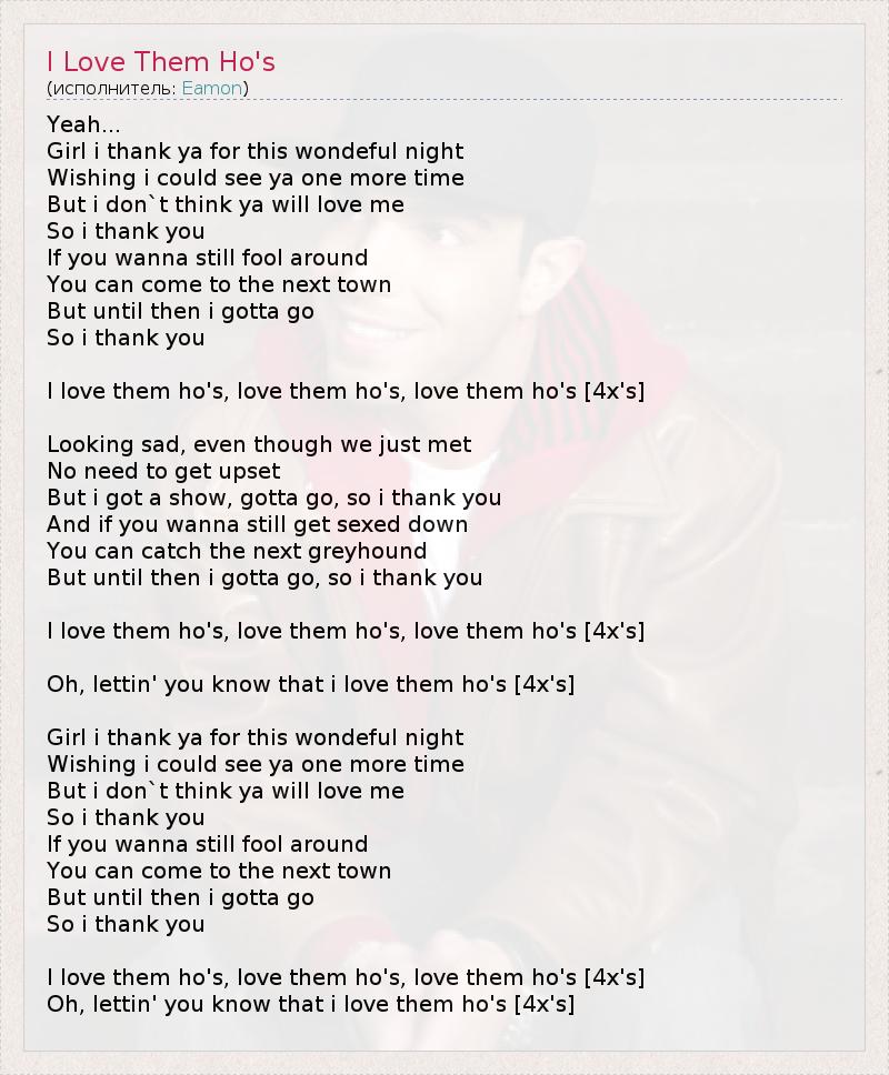 Yeah... Girl i thank ya for this wondeful night Wishing i could see ya one more time But i don`t think ya will love me So i thank you If you wanna still fool around You can come to the next town But until then i gotta go So i thank you I love them ho's, love them ho's, love them ho's [4x's] Looking sad, even though we just met No need to get upset But i got a show, gotta go, so i thank you And if you wanna still get sexed down You can catch the next greyhound But until then i gotta go, so i thank you I love them ho's, love them ho's, love them ho's [4x's] Oh, lettin' you know that i love them ho's [4x's] Girl i thank ya for this wondeful night Wishing i could see ya one more time But i don`t think ya will love me So i thank you If you wanna still fool around You can come to the next town But until then i gotta go So i thank you I love them ho's, love them ho's, love them ho's [4x's] Oh, lettin' you know that i love them ho's [4x's]