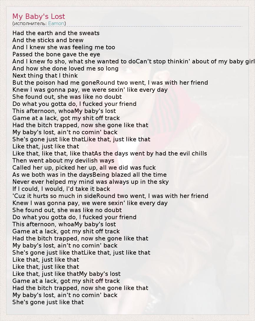 Had the earth and the sweats And the sticks and brew And I knew she was feeling me too Passed the bone gave the eye And I knew fo sho, what she wanted to doCan't stop thinkin' about of my baby girl And how she done loved me so long Next thing that I think But the poison had me goneRound two went, I was with her friend Knew I was gonna pay, we were sexin' like every day She found out, she was like no doubt Do what you gotta do, I fucked your friend This afternoon, whoaMy baby's lost Game at a lack, got my shit off track Had the bitch trapped, now she gone like that My baby's lost, ain't no comin' back She's gone just like thatLike that, just like that Like that, just like that Like that, like that, like thatAs the days went by had the evil chills Then went about my devilish ways Called her up, picked her up, all we did was fuck As we both was in the daysBeing blazed all the time Never ever helped my mind was always up in the sky If I could, I would, I'd take it back 'Cuz it hurts so much in sideRound two went, I was with her friend Knew I was gonna pay, we were sexin' like every day She found out, she was like no doubt Do what you gotta do, I fucked your friend This afternoon, whoaMy baby's lost Game at a lack, got my shit off track Had the bitch trapped, now she gone like that My baby's lost, ain't no comin' back She's gone just like thatLike that, just like that Like that, just like that Like that, just like that Like that, just like thatMy baby's lost Game at a lack, got my shit off track Had the bitch trapped, now she gone like that My baby's lost, ain't no comin' back She's gone just like that