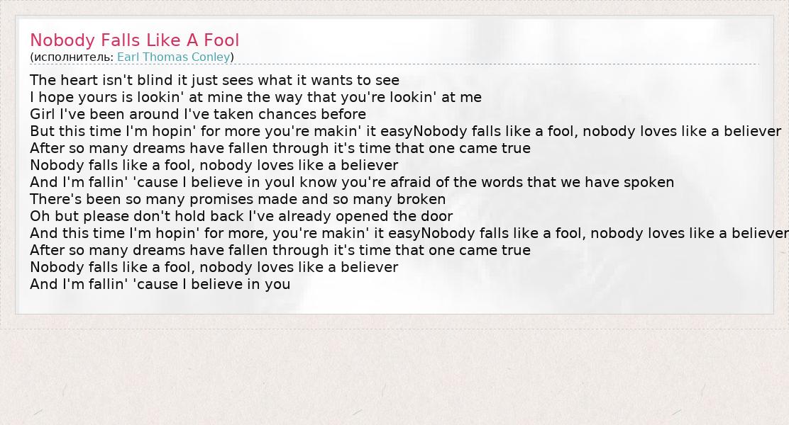 The heart isn't blind it just sees what it wants to see I hope yours is lookin' at mine the way that you're lookin' at me Girl I've been around I've taken chances before But this time I'm hopin' for more you're makin' it easyNobody falls like a fool, nobody loves like a believer After so many dreams have fallen through it's time that one came true Nobody falls like a fool, nobody loves like a believer And I'm fallin' 'cause I believe in youI know you're afraid of the words that we have spoken There's been so many promises made and so many broken Oh but please don't hold back I've already opened the door And this time I'm hopin' for more, you're makin' it easyNobody falls like a fool, nobody loves like a believer After so many dreams have fallen through it's time that one came true Nobody falls like a fool, nobody loves like a believer And I'm fallin' 'cause I believe in you