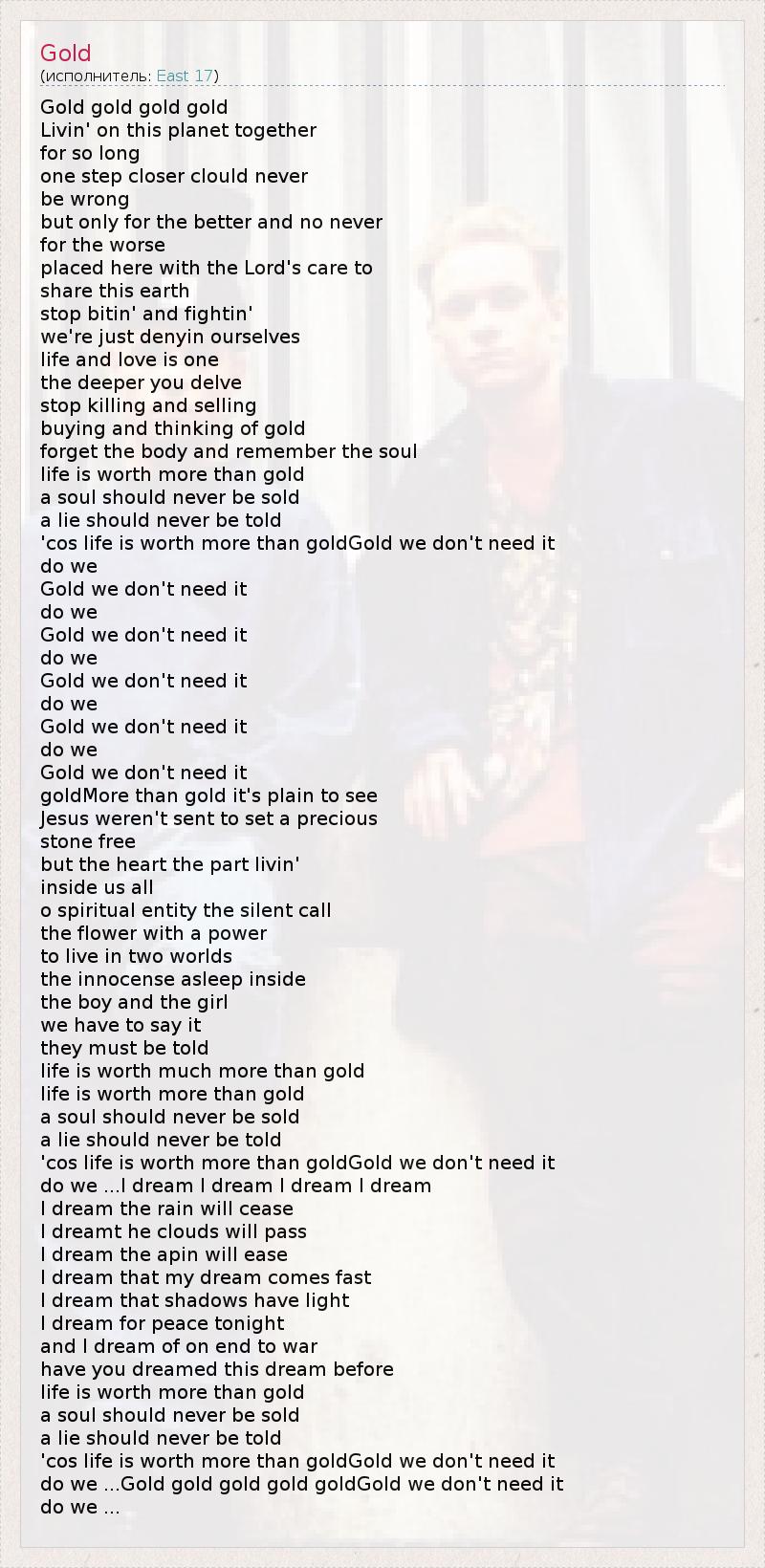 Gold gold gold gold Livin' on this planet together for so long one step closer clould never be wrong but only for the better and no never for the worse placed here with the Lord's care to share this earth stop bitin' and fightin' we're just denyin ourselves life and love is one the deeper you delve stop killing and selling buying and thinking of gold forget the body and remember the soul life is worth more than gold a soul should never be sold a lie should never be told 'cos life is worth more than goldGold we don't need it do we Gold we don't need it do we Gold we don't need it do we Gold we don't need it do we Gold we don't need it do we Gold we don't need it goldMore than gold it's plain to see Jesus weren't sent to set a precious stone free but the heart the part livin' inside us all o spiritual entity the silent call the flower with a power to live in two worlds the innocense asleep inside the boy and the girl we have to say it they must be told life is worth much more than gold life is worth more than gold a soul should never be sold a lie should never be told 'cos life is worth more than goldGold we don't need it do we ...I dream I dream I dream I dream I dream the rain will cease I dreamt he clouds will pass I dream the apin will ease I dream that my dream comes fast I dream that shadows have light I dream for peace tonight and I dream of on end to war have you dreamed this dream before life is worth more than gold a soul should never be sold a lie should never be told 'cos life is worth more than goldGold we don't need it do we ...Gold gold gold gold goldGold we don't need it do we ...