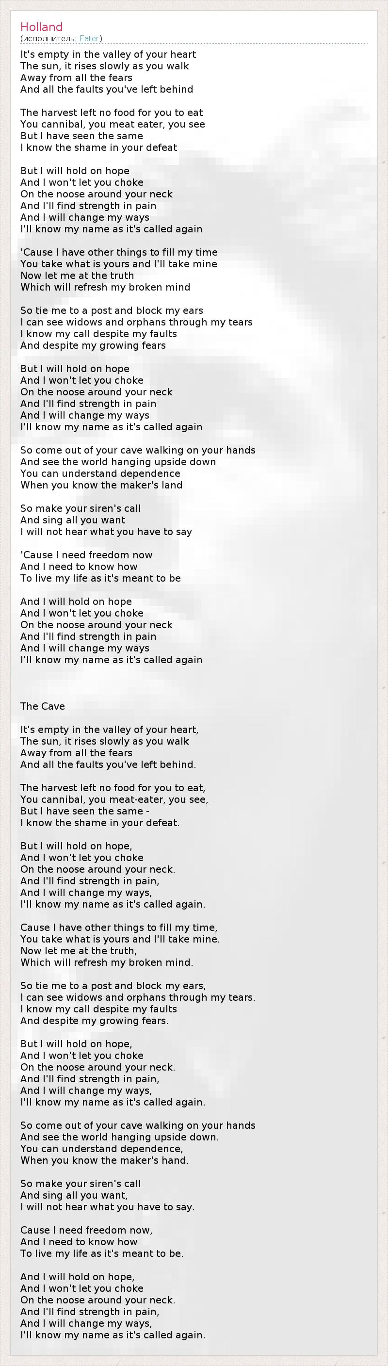 В долине твоей души пусто, Солнце светит медленно, а ты уходишь От всех страхов И совершённых ошибок. Урожай не оставил для тебя еды, Ты – каннибал, хищник, пойми. Но я видел это раньше И я знаю, как стыдно поражение. Но я буду держаться за надежду И не позволю тебе удушиться Петлёй, накинутой на шею. Я найду источник силы в боли И изменю свои действия, Я узнаю своё имя, потому что меня снова зовут. Ведь у меня хватает и других дел, Бери своё, и я возьму своё, А теперь пусти меня к правде, Которая восстановит мои разрозненные мысли. Так привяжи меня к столбу и заткни мне уши, Сквозь слёзы я вижу вдов и сирот. Я знаю своё призвание, несмотря на ошибки И несмотря на свой растущий страх. И я буду держаться за надежду И не позволю тебе удушиться Петлёй, накинутой на шею. Я найду источник силы в боли И изменю свои действия, Я узнаю своё имя, потому что меня снова зовут. Так выйди из своей пещеры на руках И взгляни на перевёрнутый мир. Ты сможешь осознать зависимость, Узнав землю Создателя. Пусть зов сирены зазвучит из твоих уст, Пой всё, что только пожелаешь, Я не услышу, что ты должен был сказать. Потому что мне сейчас нужна свобода, Мне нужно знать, как провести жизнь По-настоящему. И я буду держаться за надежду И не позволю тебе удушиться Петлёй, накинутой на шею. Я найду источник силы в боли И изменю свои действия, Я узнаю своё имя, потому что меня снова зовут. Пещера (перевод Lisa Stigliz) Пустынно в долине твоего сердца, Солнце медленно встает, когда ты Идешь прочь от всех страхов И ошибок, которые ты оставил позади. Урожай не оставил тебе ни крошки, Ты – каннибал, поедающий мясо, ты знаешь это, Но я прошёл через то же самое – Я знаю весь стыд твоего поражения. Но я буду надеяться И не дам тебе задохнуться От петли на твоей шее. И я найду силу в боли, И я пересмотрю свои взгляды, Я вспомню своё имя, когда буду призван. Ибо мне есть, чем занять своё время, Забирай то, что принадлежит тебе, а я возьму своё. Теперь пусти меня к правде, Которая освежит мой сломленный рассудок. Привяжи меня к столбу и оглуши, Я вижу вдов и сирот сквозь слёзы, Я знаю свое призвание, несмотря на ошибки И мои растущие страхи. Но я буду надеяться И не дам тебе задохнуться От петли на твоей шее. И я найду силу в боли, И я пересмотрю свои взгляды, Я вспомню своё имя, когда буду призван. Так что выходи из своей пещеры на руках И взгляни на перевернутый мир. Ты поймёшь, насколько мы зависимы, Когда узнаешь руку создателя. Так что дай своим сиренам звать, Пой, что хочешь, Я не услышу того, что тебе придётся сказать. Потому что теперь мне нужна свобода, И мне нужно знать, как прожить свою жизнь Так, как мне было предназначено. Я буду надеяться И не дам тебе задохнуться От петли на твоей шее. И я найду силу в боли, И я пересмотрю свои взгляды, Я вспомню своё имя, когда буду призван.
