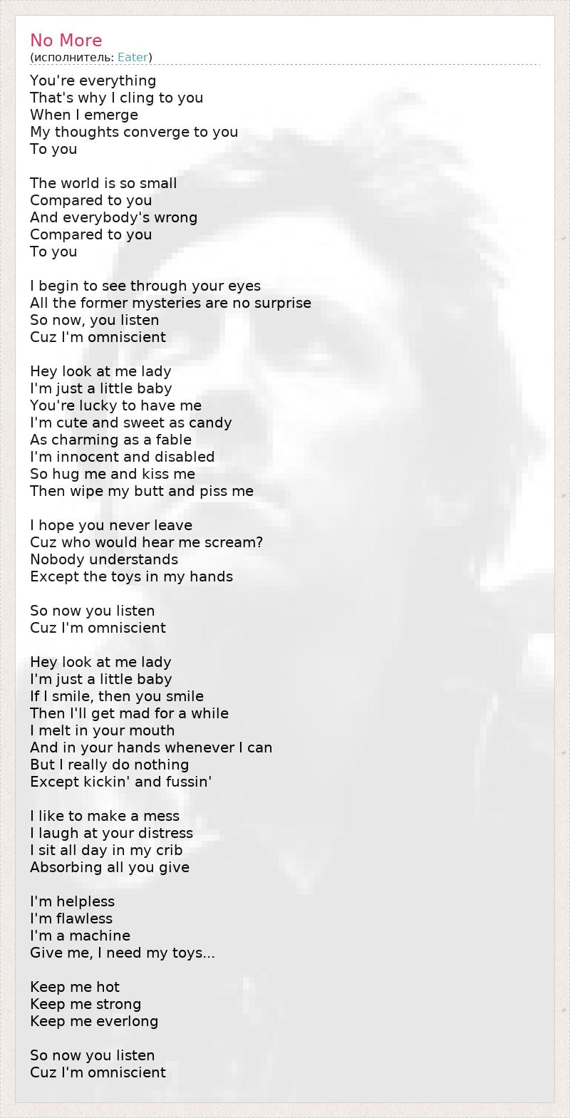 Ты – всё самое важное. Вот почему я льну к тебе. Когда я появился, Мои мысли сошлись на тебе. На тебе. Мир такой маленький По сравнению с тобой. И все неправы По сравнению с тобой. С тобой. Я начинаю видеть твоими глазами. Все прежние тайны не удивляют. Так что теперь послушай, Потому что я всеведущий. Эй, посмотри на меня, леди. Я всего лишь маленький ребёнок. Тебе повезло, что я есть у тебя. Я милый и сладкий, как конфета. Очаровательный, как выдумка. Я невинный и нетрудоспособный. Так сожми меня в объятиях и целуй меня, Затем вытри мою попу и помоги мне пописать. Я надеюсь, ты никогда не уйдёшь. Потому что кто бы услышал мой крик? Никто не понимает, Кроме игрушек в моих руках. Так что теперь слушай, Потому что я всеведущий Эй, посмотри на меня, леди. Я всего лишь маленький ребёнок. Если я улыбаюсь, то и ты улыбаешься. Потом я ненадолго рассержусь. Я таю у тебя во рту И в твоих руках, когда могу. Но я действительно не делаю ничего, Только брыкаюсь и суечусь. Мне нравится устраивать беспорядок. Я смеюсь над твоим страданием. Я сижу весь день в своей кроватке, Впитывая всё, что ты даёшь. Я беспомощный, Я безупречный, Я – механизм. Отдай! Мне нужны мои игрушки. Береги меня страстно, Береги меня крепко, Береги меня вечно. Теперь ты слушаешь, Потому что я всеведущий.